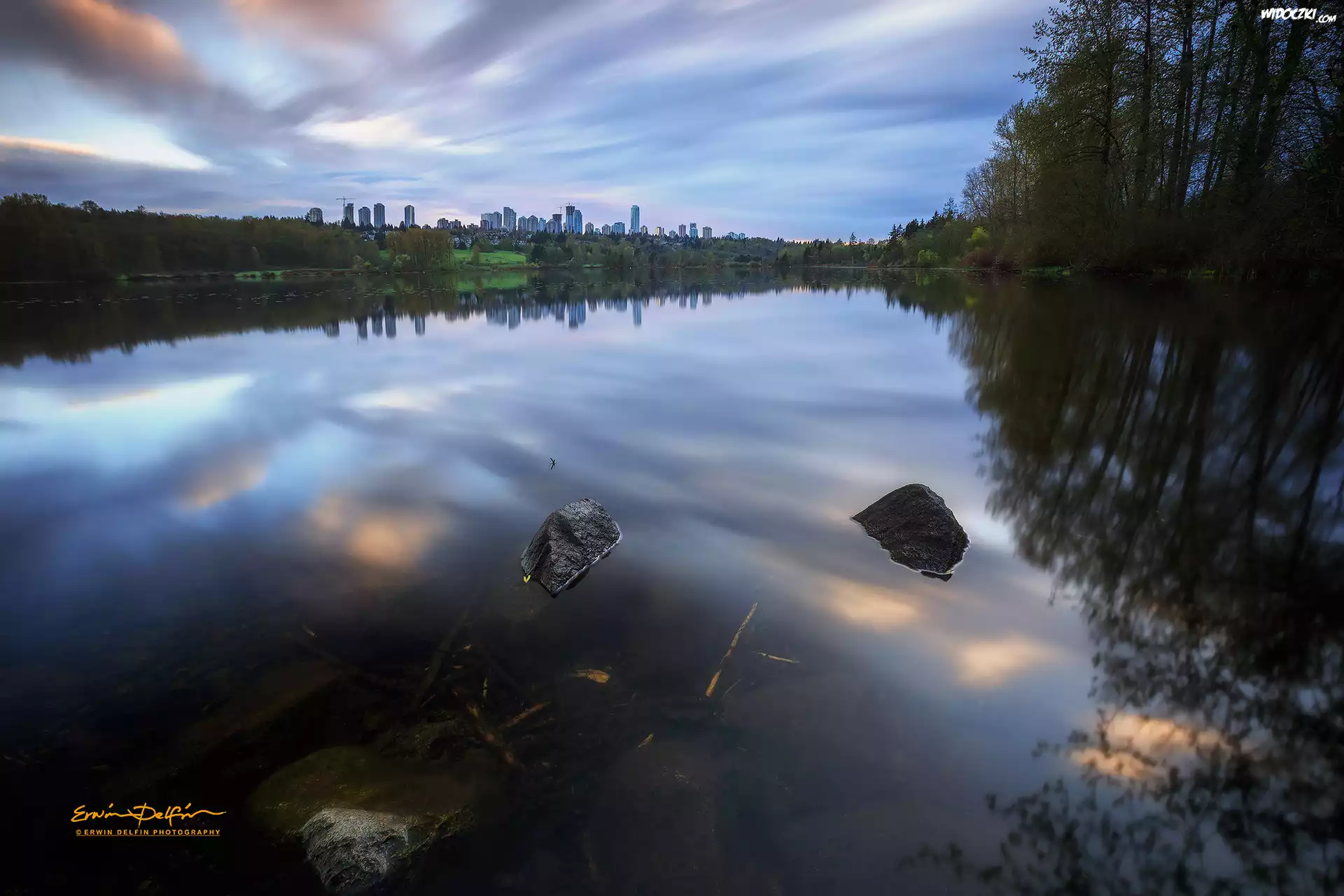 Zdjęcia, Zachód słońca, Zarośla, Kamienie, Odbicie, Jezioro Deer, Deer Lake Park, Burnaby, Kanada