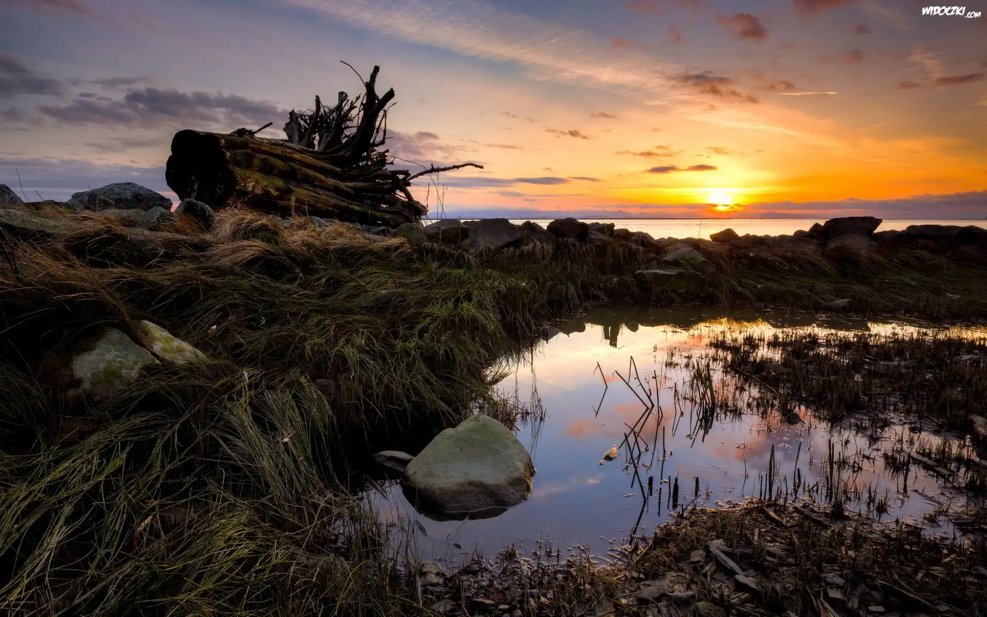 Zdjęcia, Jezioro, Kłoda, Zachód Słońca