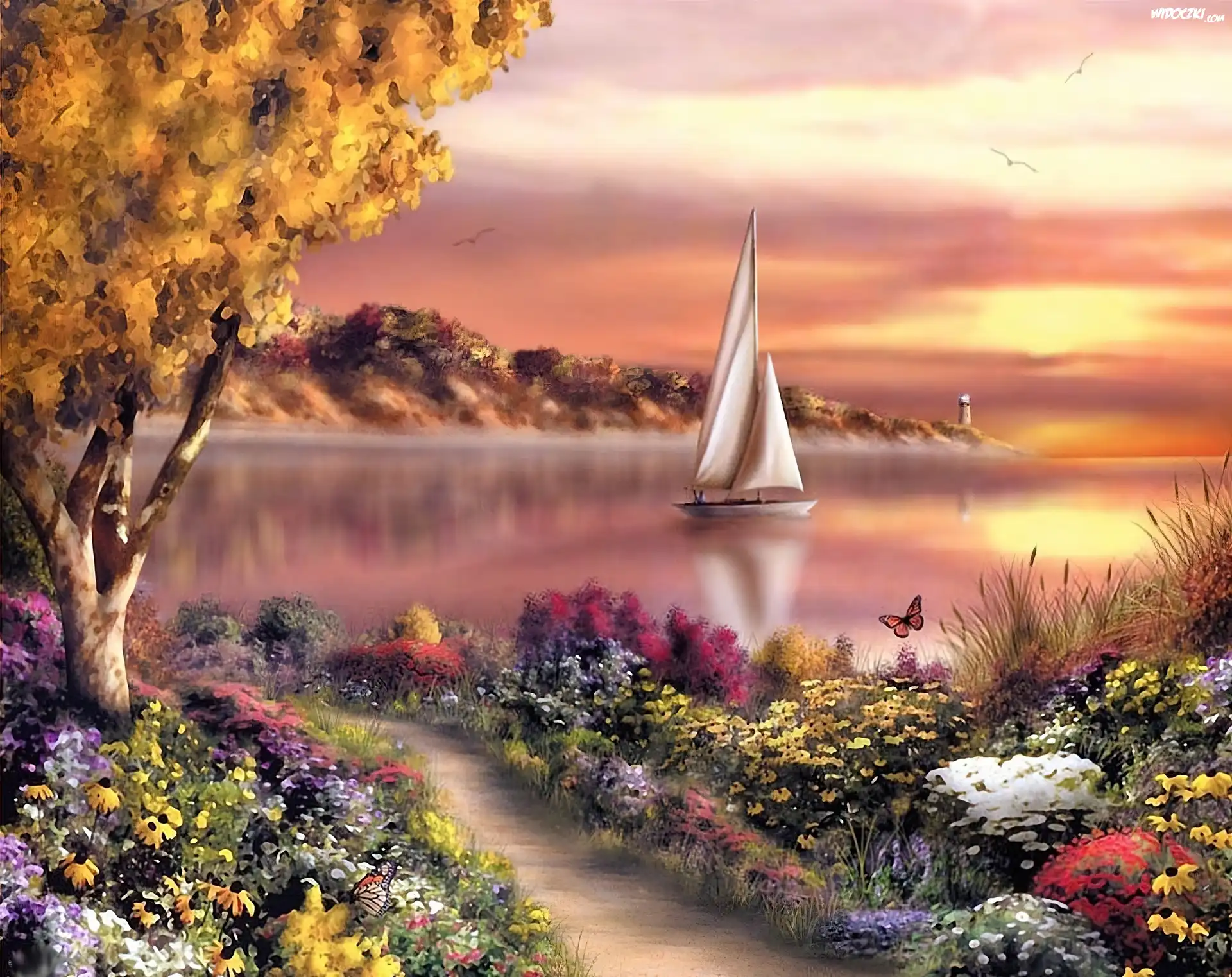 Zdjęcia, Jezioro, Żaglówka, Kwiaty, Zachód, Słońca