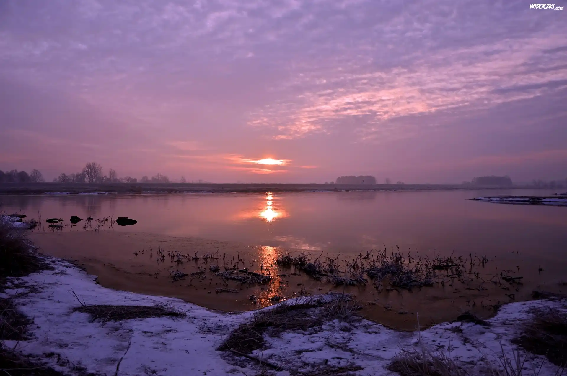 Jezioro, Brzeg, Śnieg, Zachód słońca