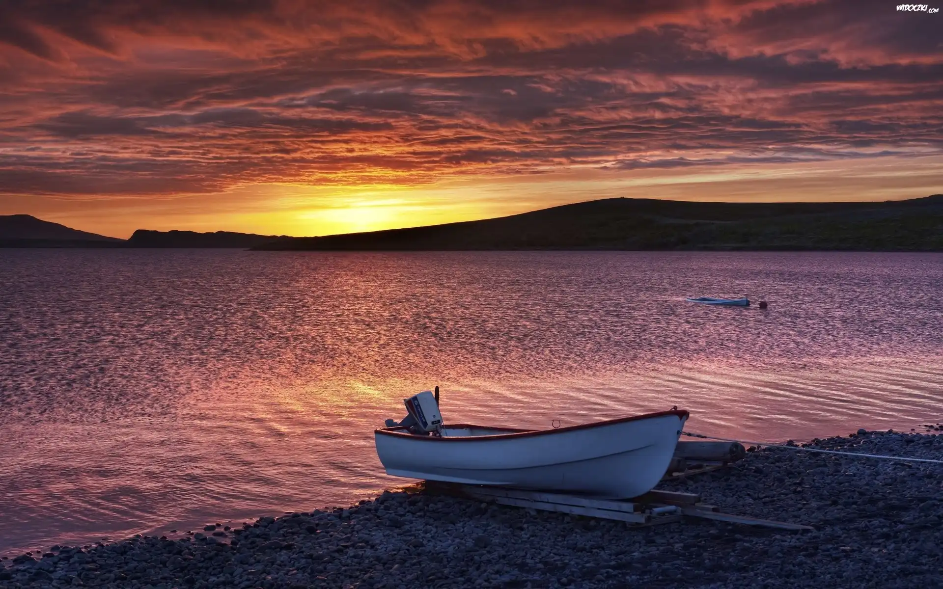 Jezioro, Góry, Łodzie, Zachód, Słońca