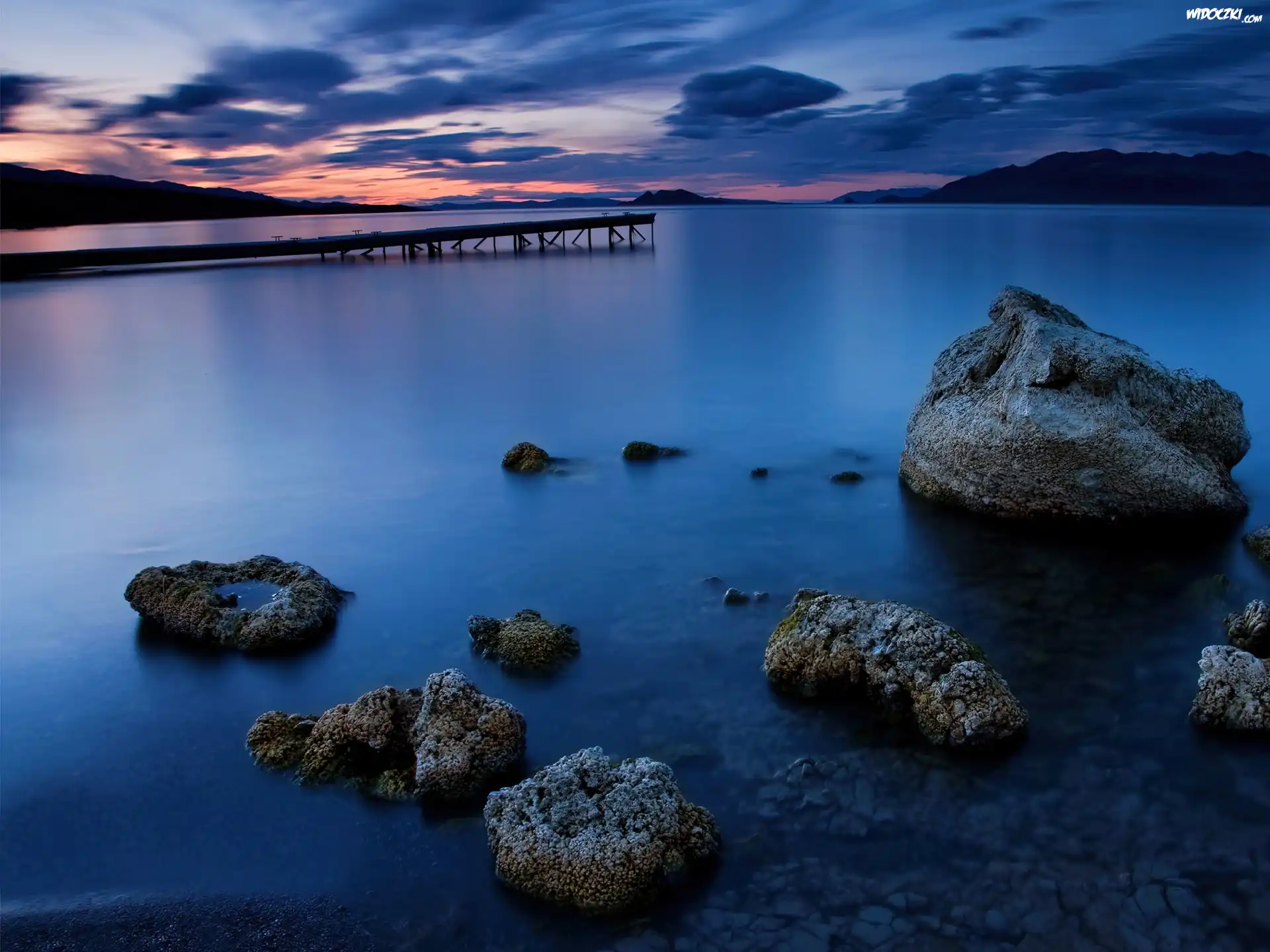 Zdjęcia, Jezioro, Kamienie, Pomost, Zachód Słońca