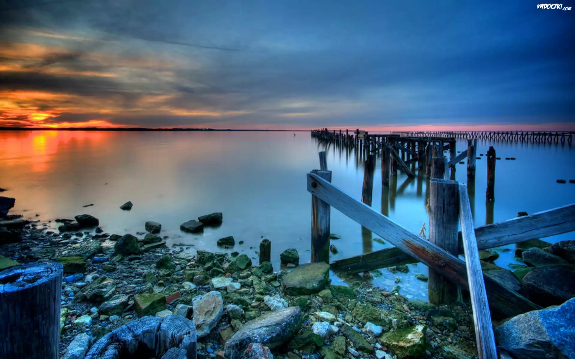 Zdjęcia, Jezioro, Kamienie, Pomost, Zachód Słońca