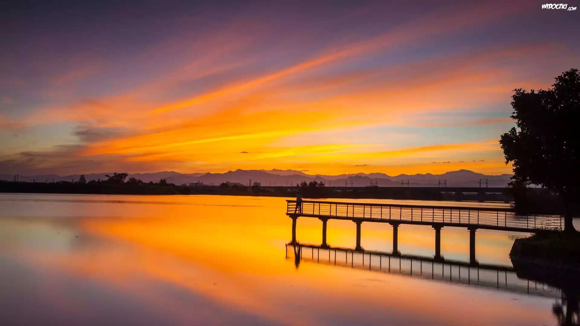 Zdjęcia, Jezioro, Góry, Pomost, Piękny, Zachód, Słońca