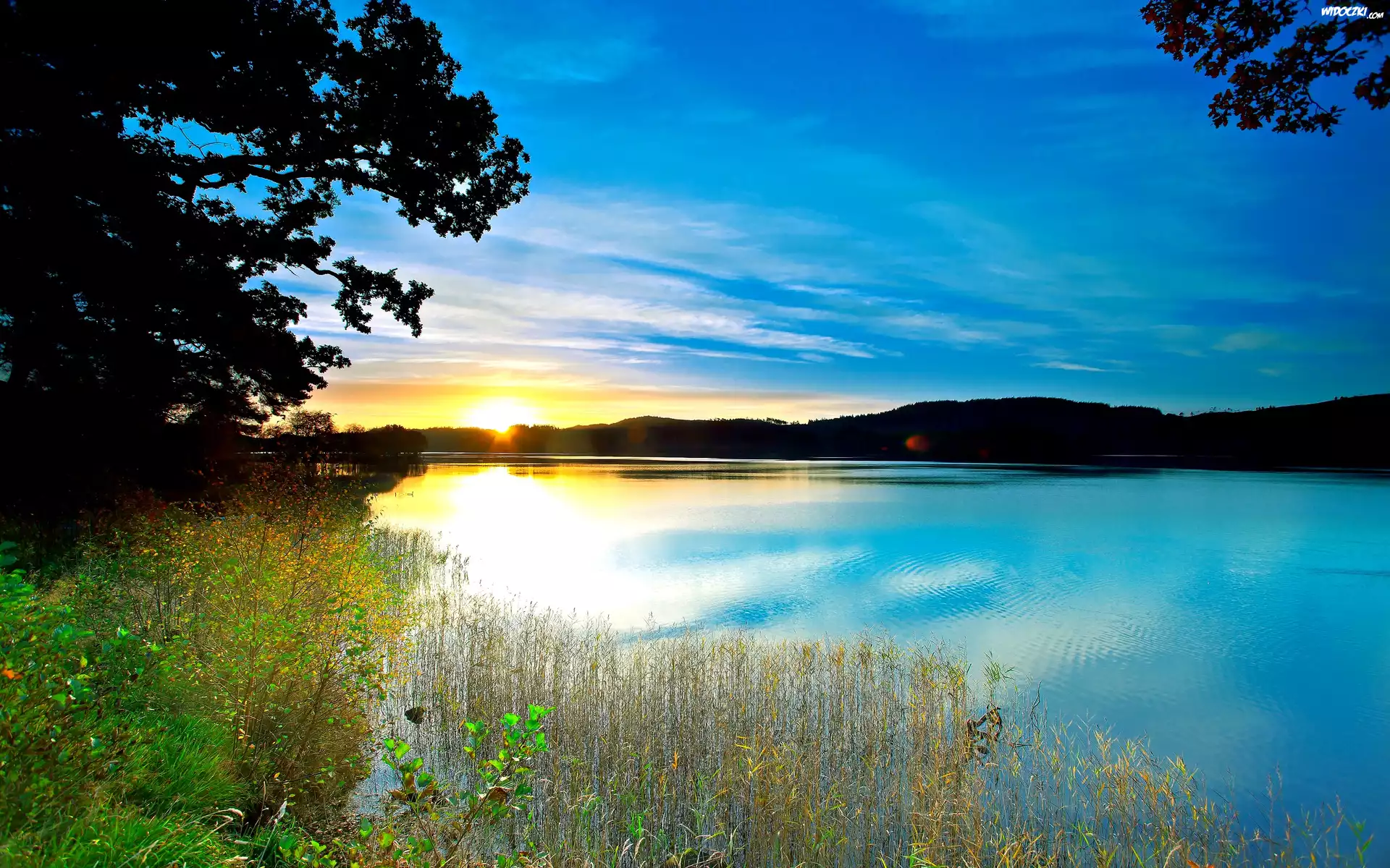 Zdjęcia, Jezioro, Szuwary, Zachód, Słońca