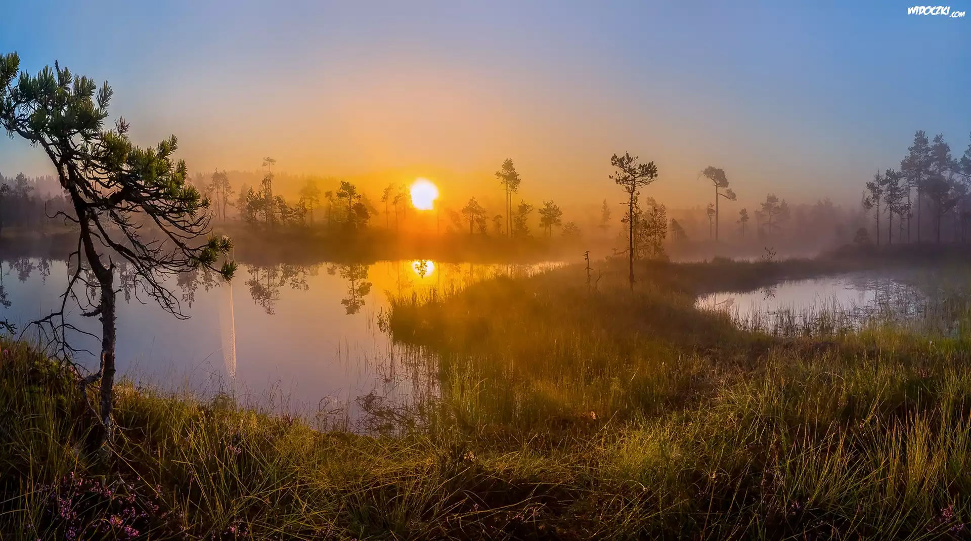 Zdjęcia, Jezioro, Drzewa, Trawa, Mgła, Zachód słońca