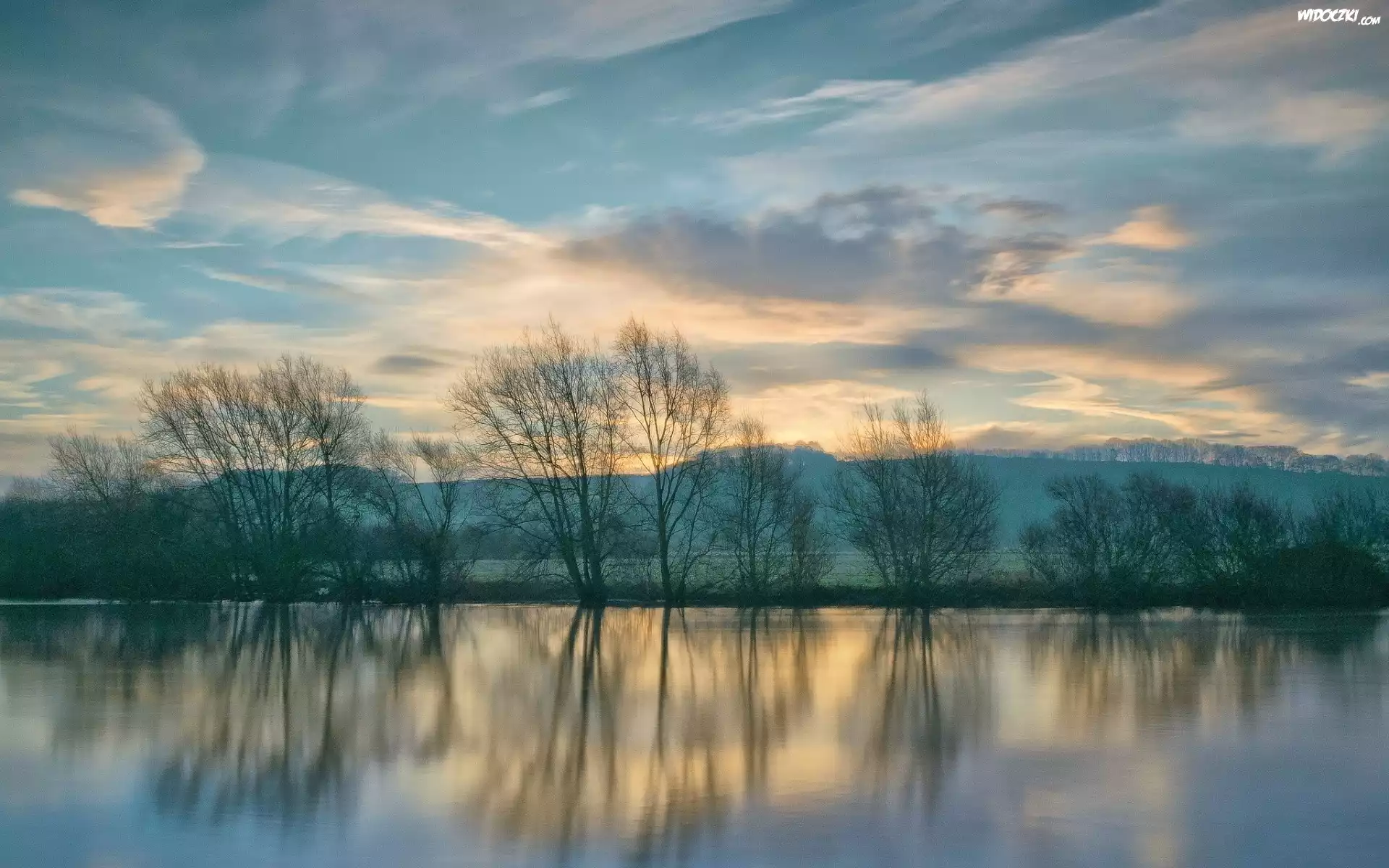 Jezioro, Drzewa, Wzgórza, Zachód, Słońca