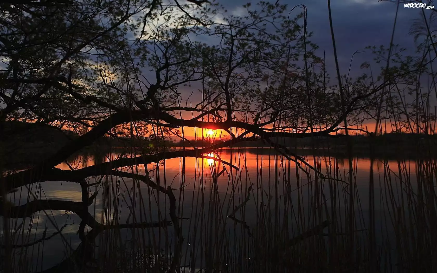 Jezioro, Zachód, Słońca, Zarośla, Gałęzie