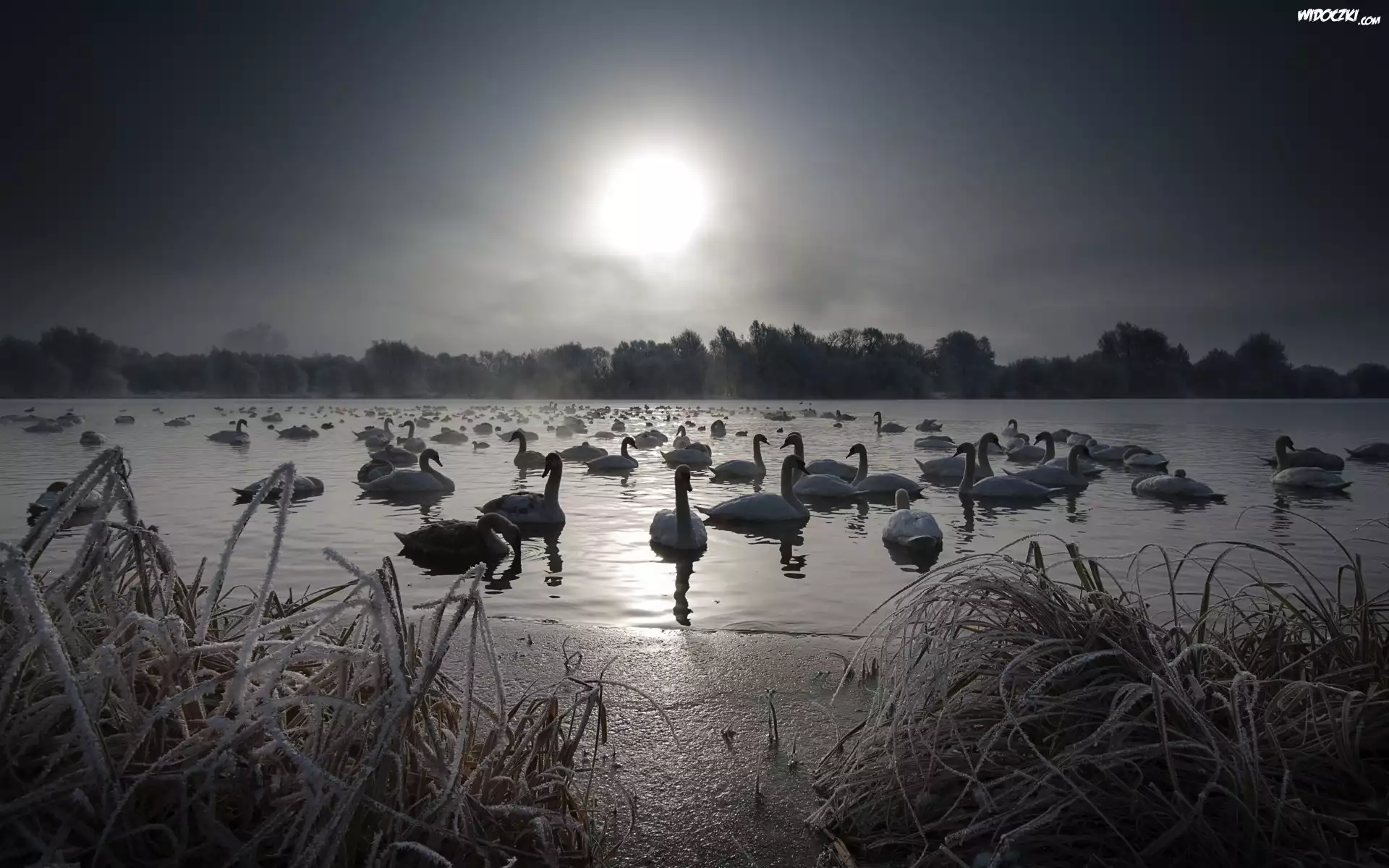 Zdjęcia, Zima, Jezioro, Łabędzie