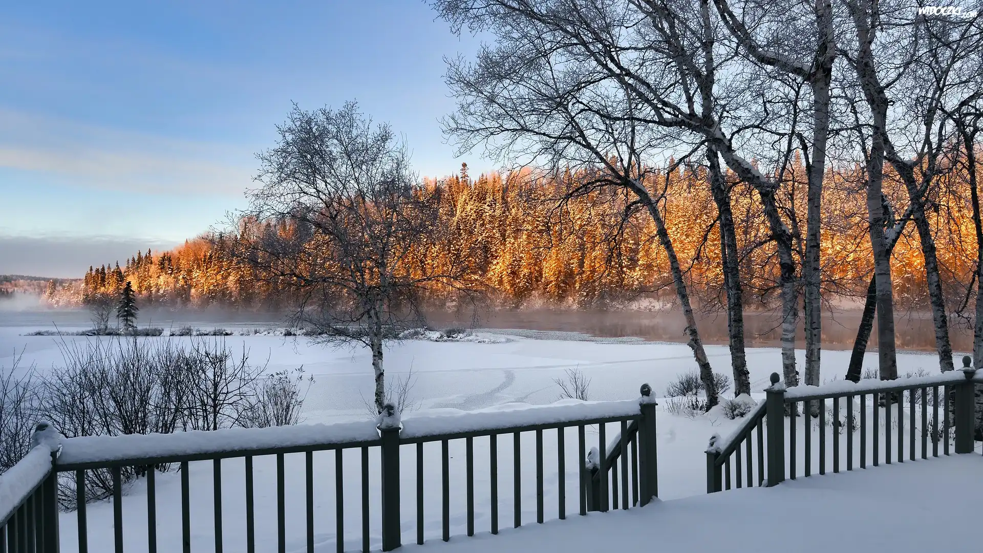 Zdjęcia, Zima, Drzewa, Balustrada, Jezioro