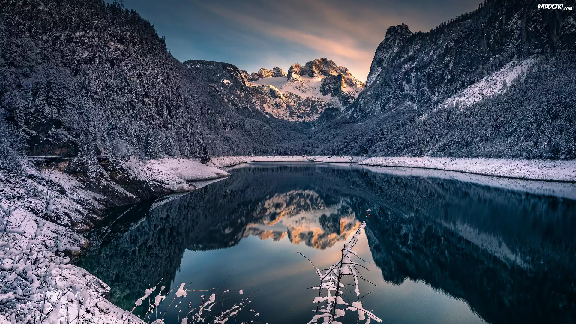 Zdjęcia, Góry Dachstein, Jezioro Gosauseen, Zima, Lasy, Drzewa, Powiat Gmunden, Gosau, Austria