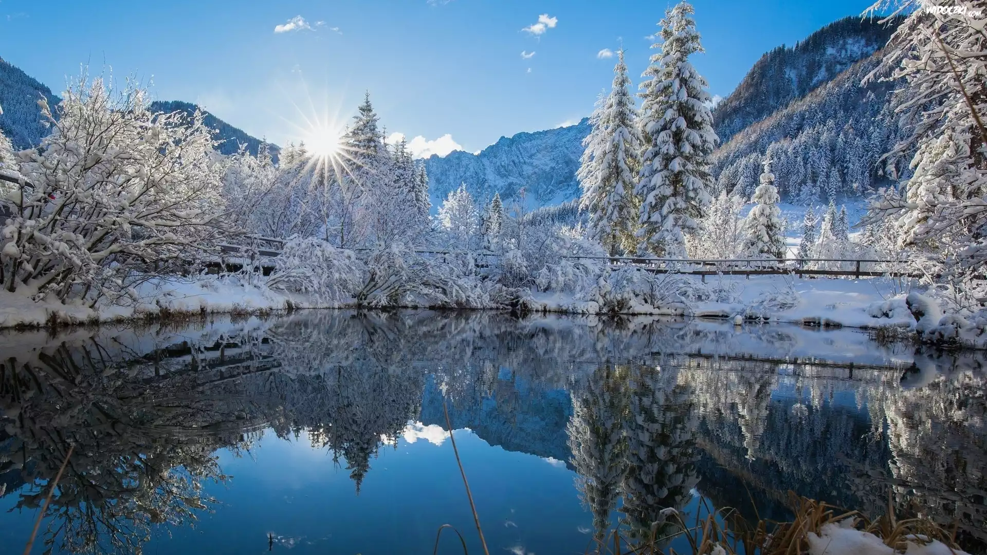 Zdjęcia, Zima, Jezioro, Drzewa, Góry, Promienie słońca, Odbicie