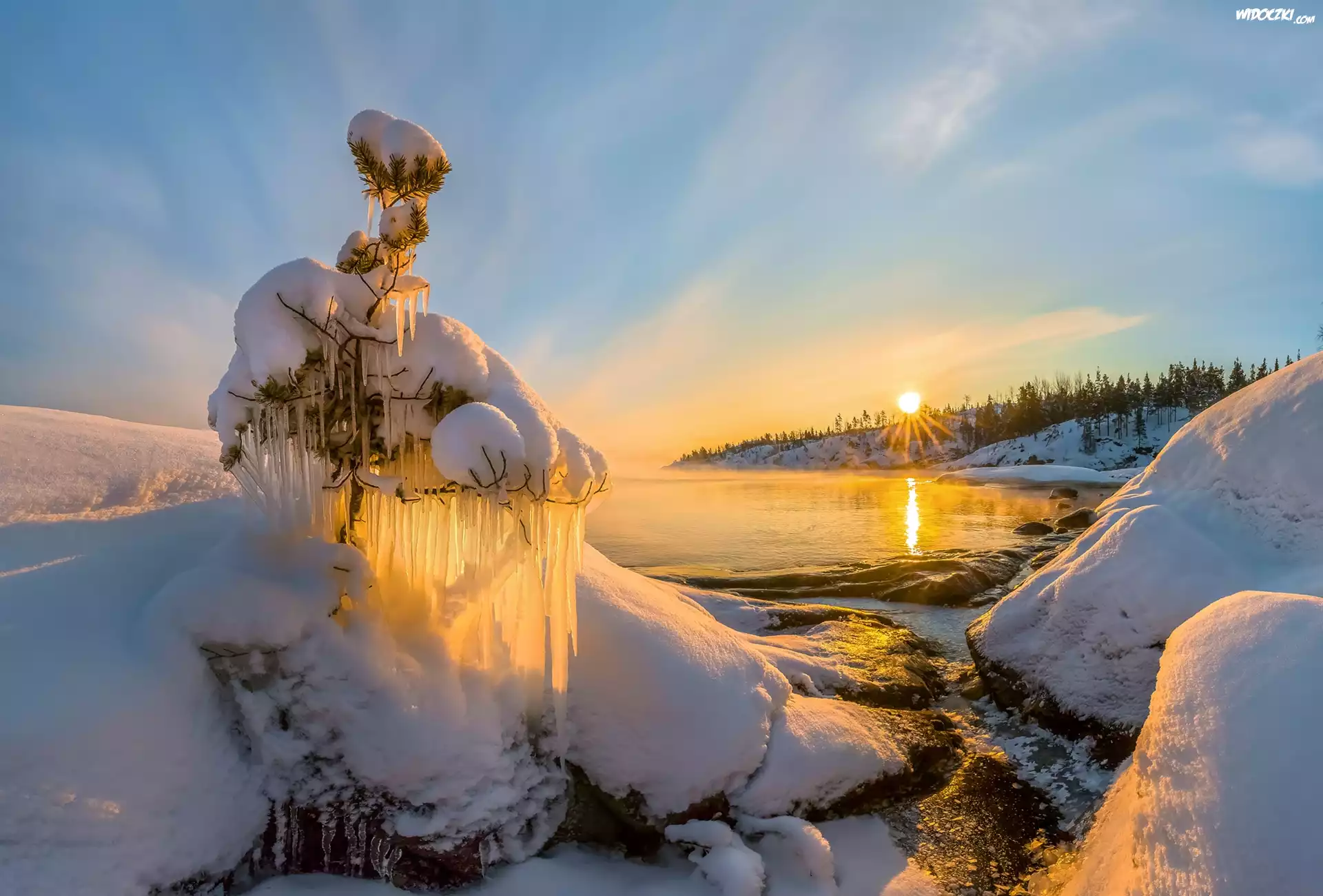 Zdjęcia, Zima, Jezioro, Zaśnieżone, Drzewko, Sople, Promienie słońca