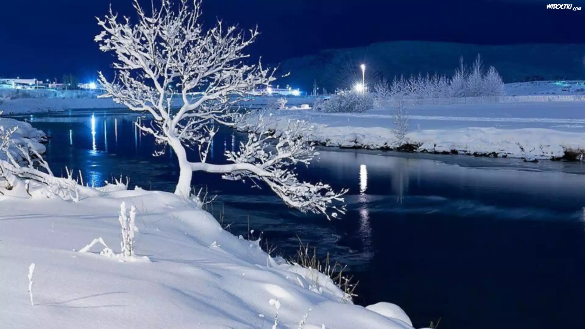 Jezioro, Drzewo, Zimowa, Noc