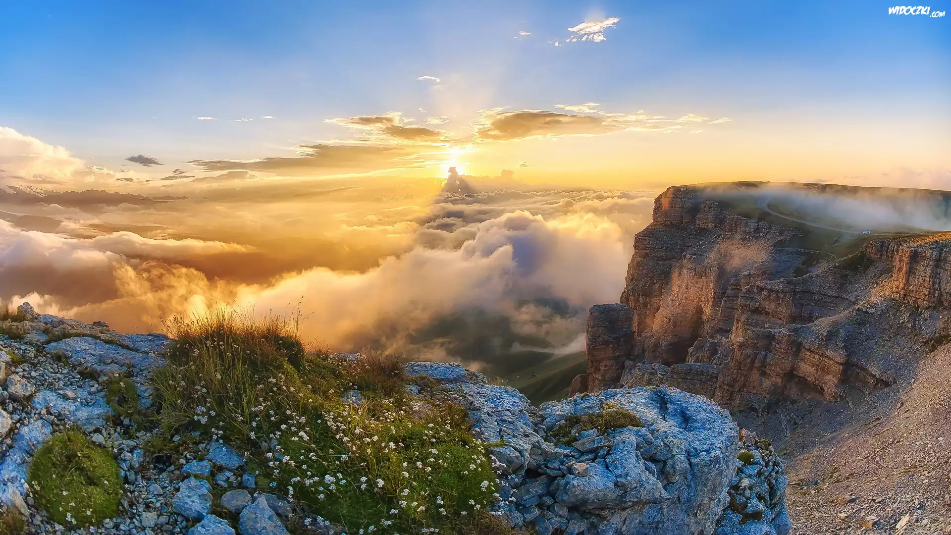 Rosja, Kaukaz, Kabardo-Bałkaria, Góry, Skały, Kamienie, Mgła, Wschód słońca, Chmury