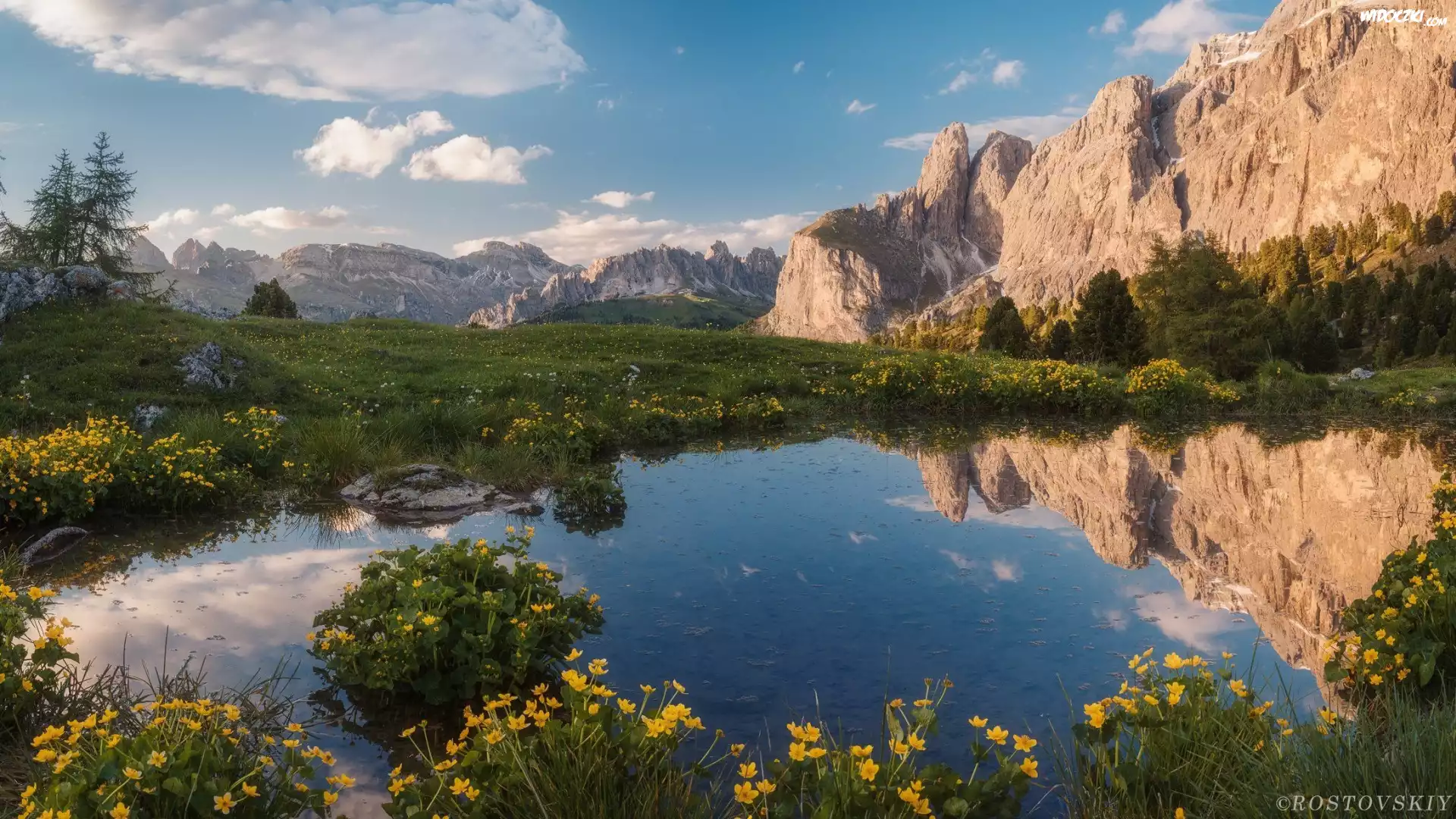 Zdjęcia, Góry, Staw, Kwiaty, Kaczeńce, Drzewa, Trawa