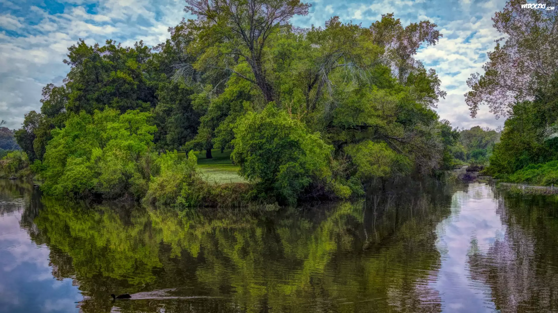 Zdjęcia, Staw, Kaczka, Odbicie, Drzewa, Wyspa