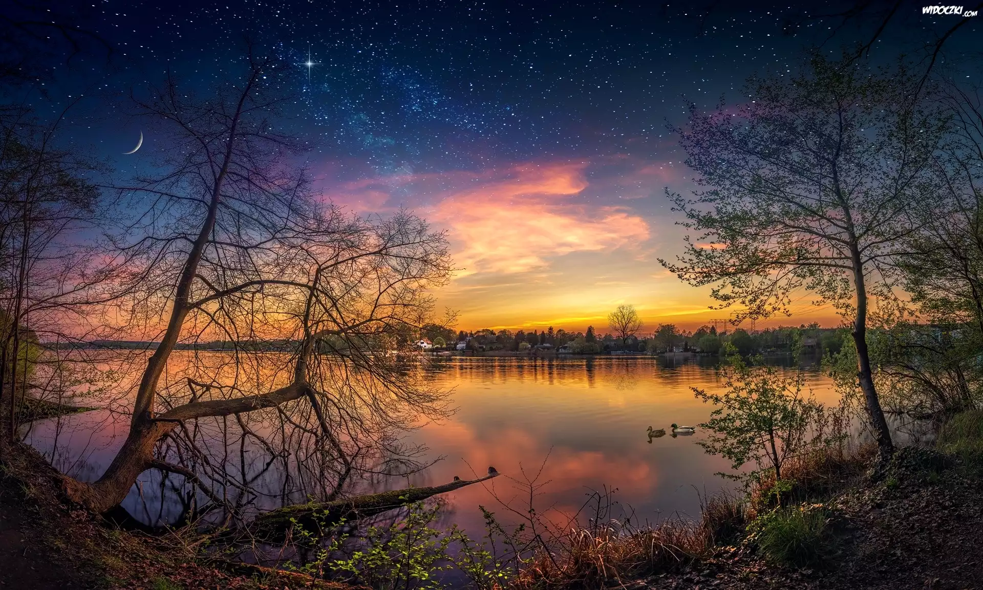 Jezioro, Kaczki, Zachód Słońca, Gwiazdy, Drzewa, Domy