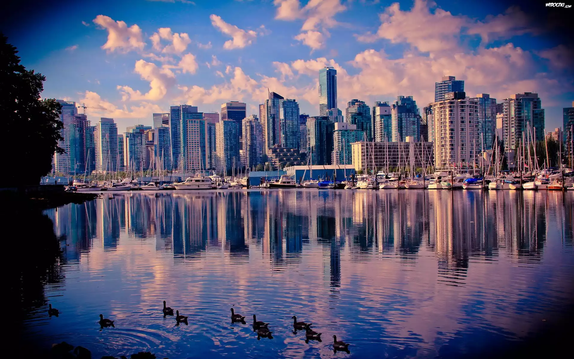 Zdjęcia, Kanada, Vancouver, Żaglówki, Przystań, Rzeka Fraser, Kaczki