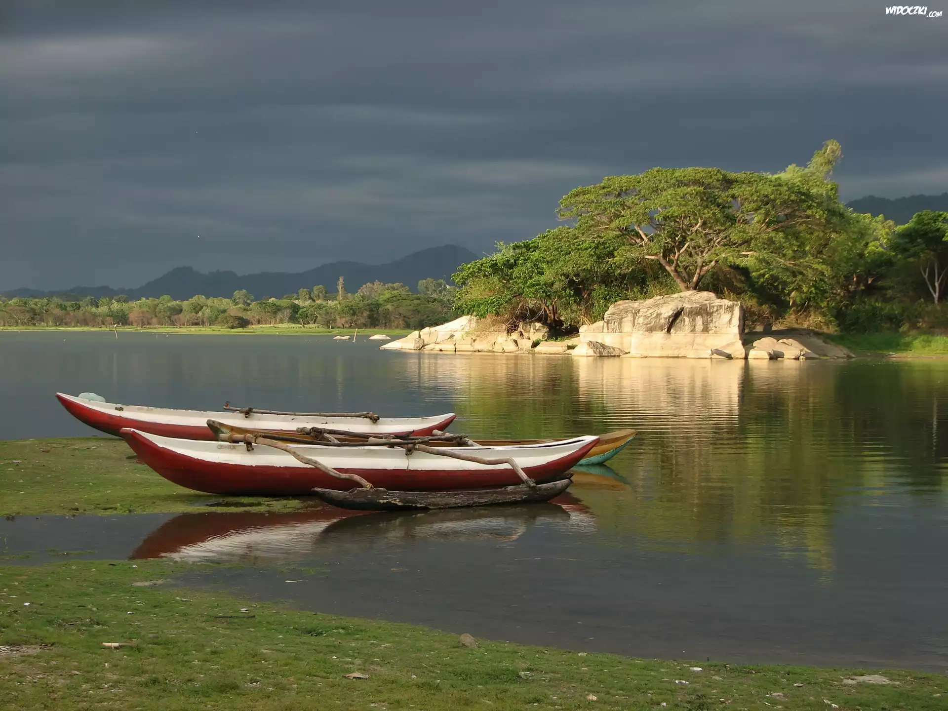 Zdj臋cia, Jezioro, Kajaki, Skalisty, Brzeg, Drzewa, Sri Lanka
