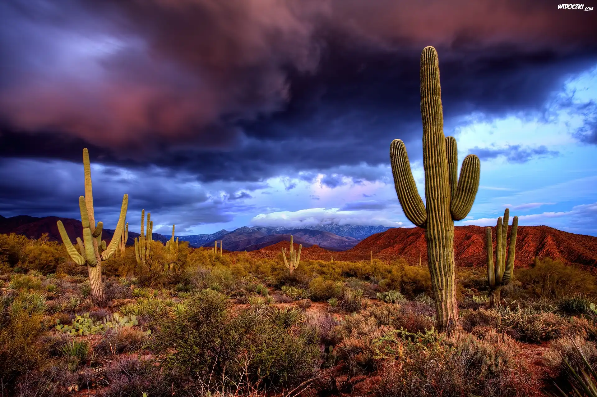 Kaktusy, Saguaro, Karnegia olbrzymia, Fioletowo, Granatowe, Chmury, Park Narodowy Saguaro, Stan Arizona, Stany Zjednoczone |