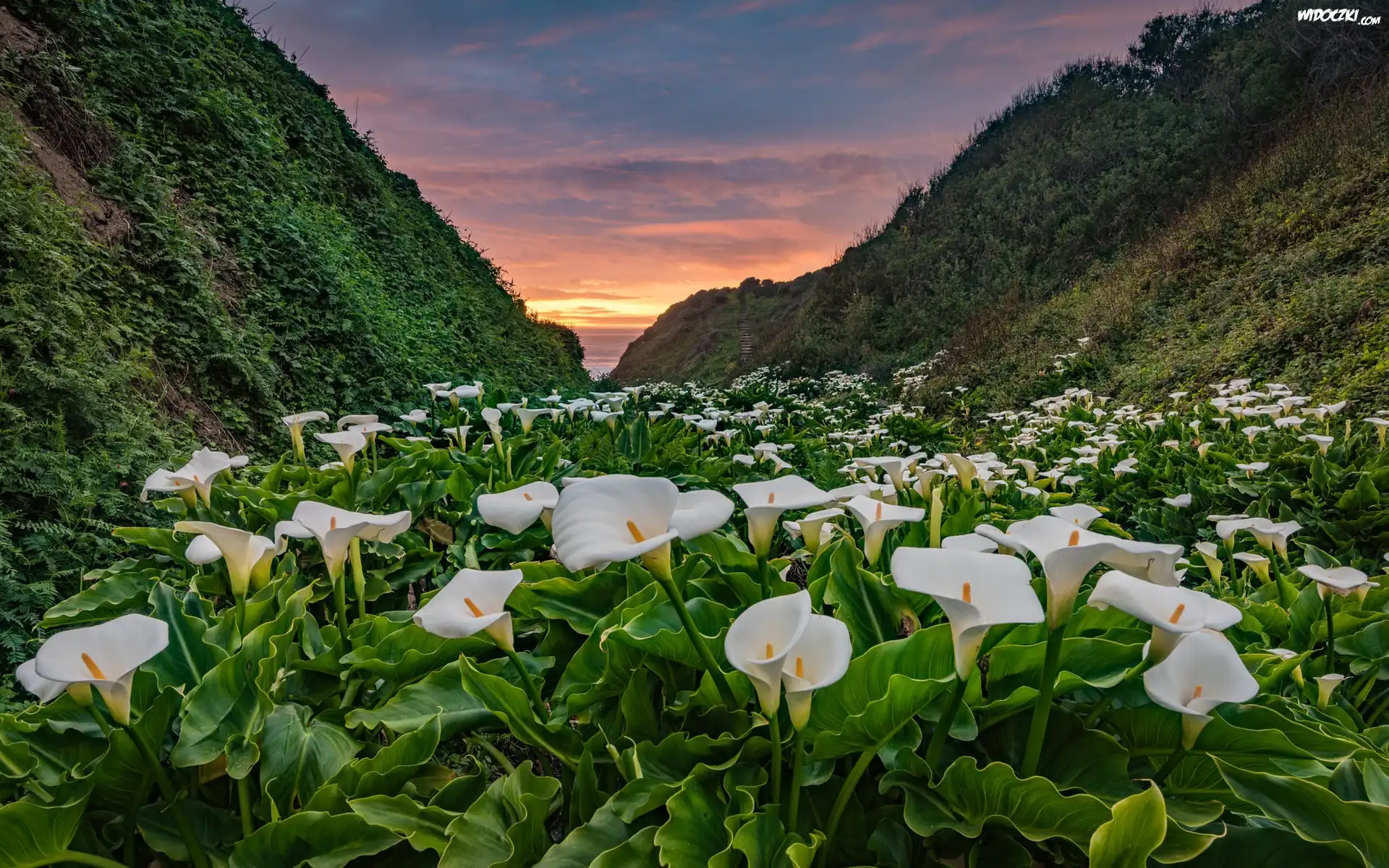 Stany Zjednoczone, Kalifornia, Park stanowy Garrapata, Góry, Dolina, Kwiaty, Kalie, Zachód słońca |