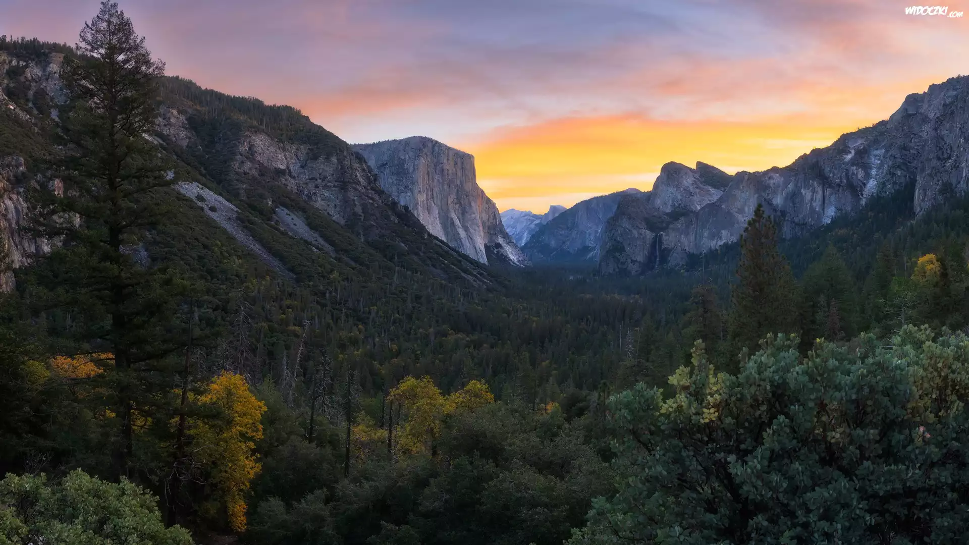 Góry, Las, Drzewa, Park Narodowy, Yosemite, Zachód słońca, Stan Kalifornia, Stany Zjednoczone