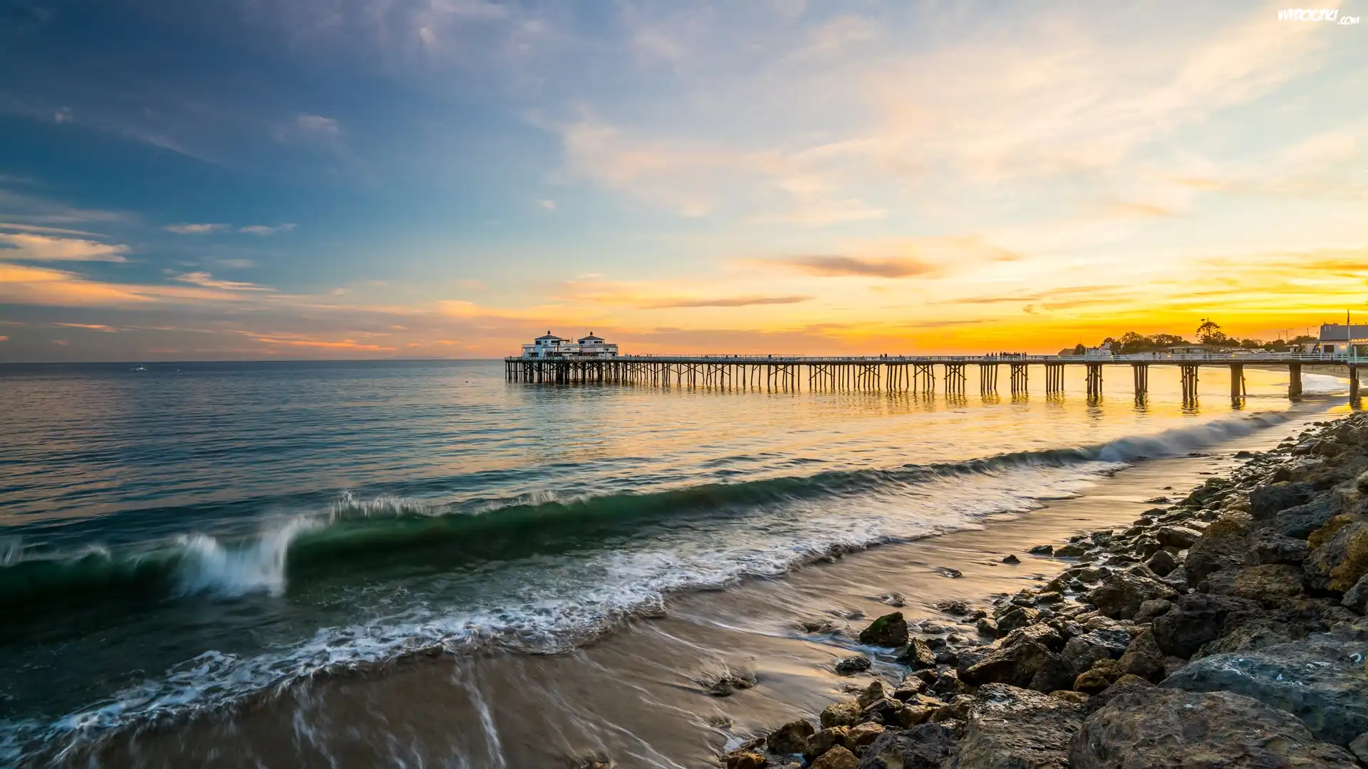 Zdjęcia, Stany Zjednoczone, Kalifornia, Malibu, Morze, Molo, Wybrzeże, Fale, Kamienie, Wschód słońca