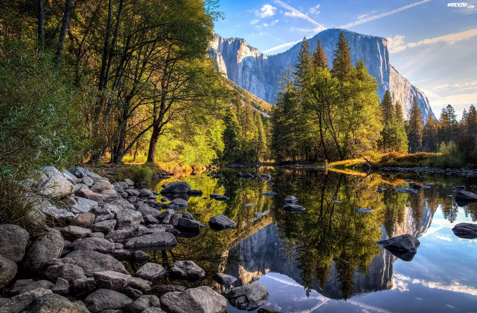 Zdjęcia, Stany Zjednoczone, Kalifornia, Park Narodowy Yosemite, Kamienie, Drzewa, Góry, Rzeka, Odbicie