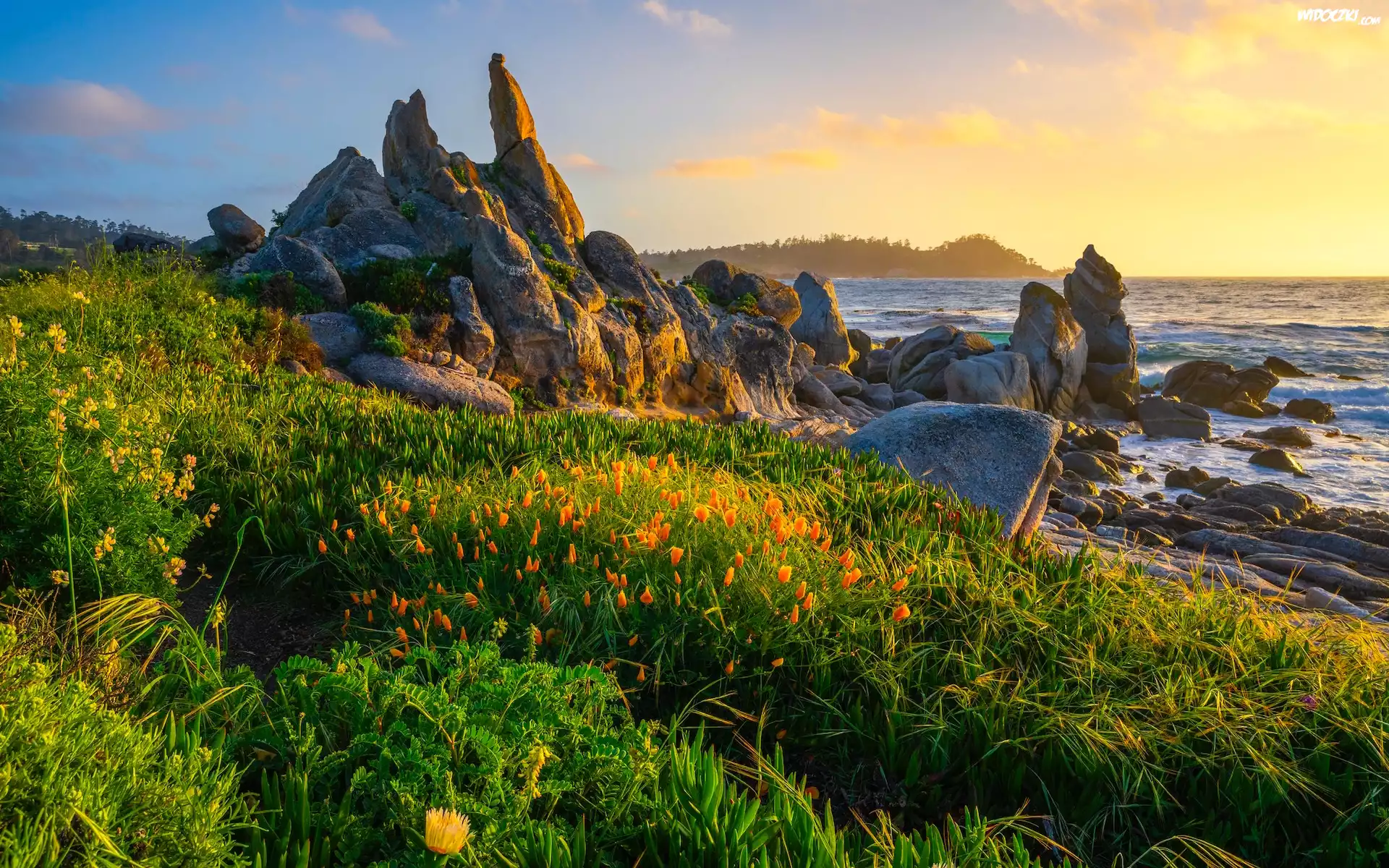 Morze, Skały, Łąka, Kwiaty Stany Zjednoczone, Kalifornia, Półwysep Monterey, Zatoka Carmel