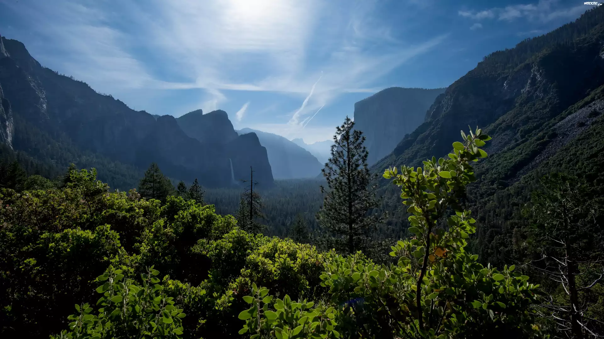 Park Narodowy Yosemite, Góry, Drzewa, Mgła, Skały, Liście, Wodospad, Kalifornia, Stany Zjednoczone
