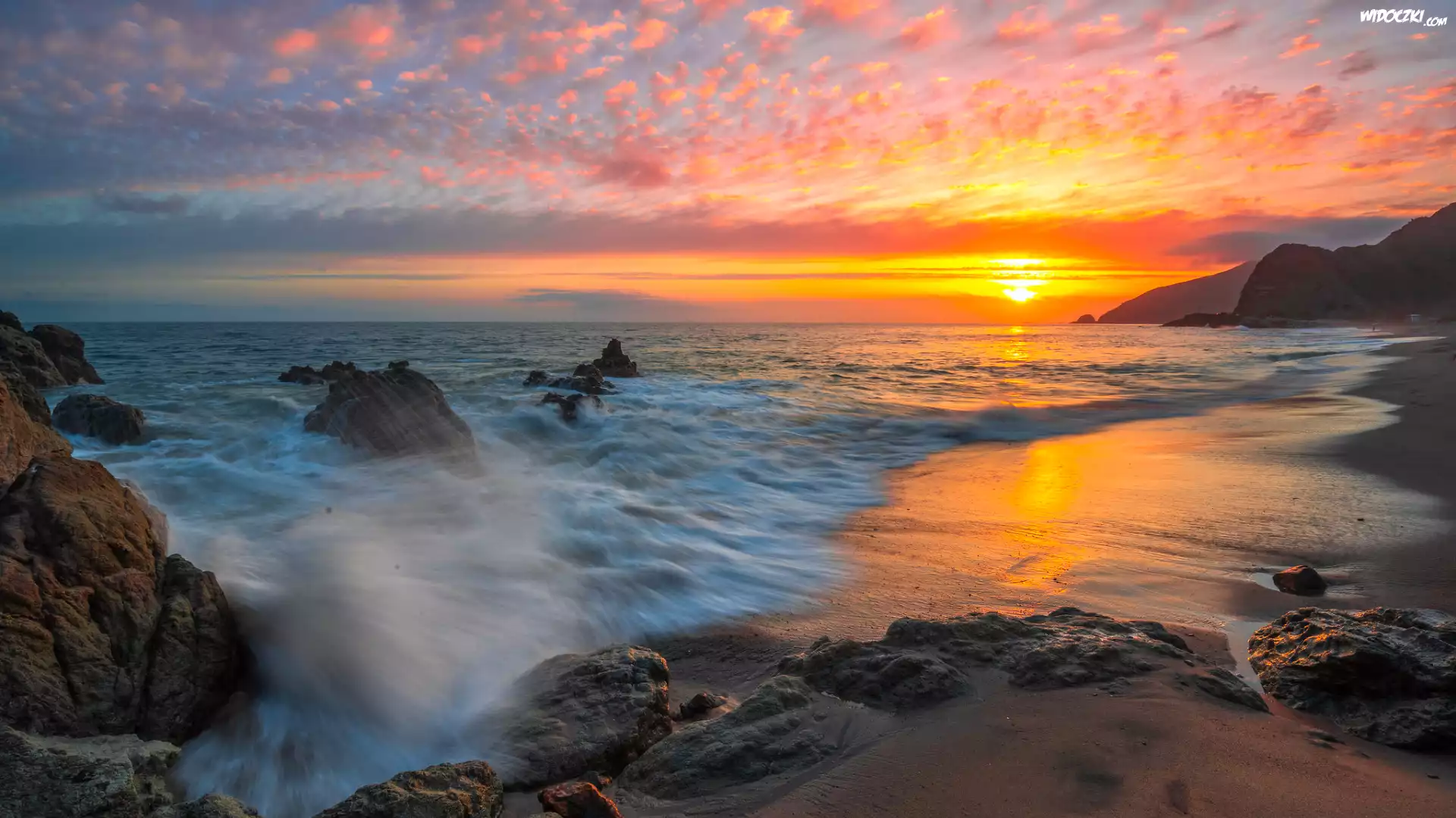 Morze, Skały, Zachód słońca, Plaża, Wybrzeże, Hrabstwo Mugu, Malibu, Kalifornia, Stany Zjednoczone |