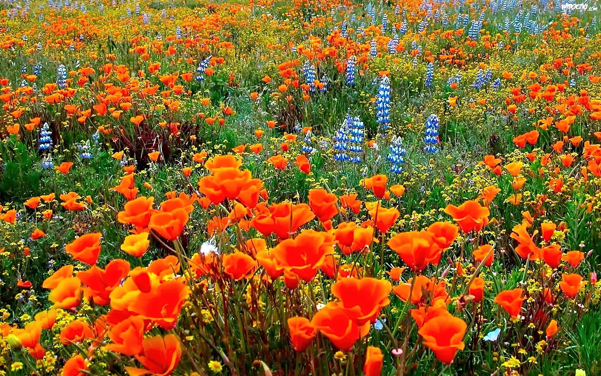 Zdjęcia, Łąka, Maki, Kalifornijskie, Szafirki