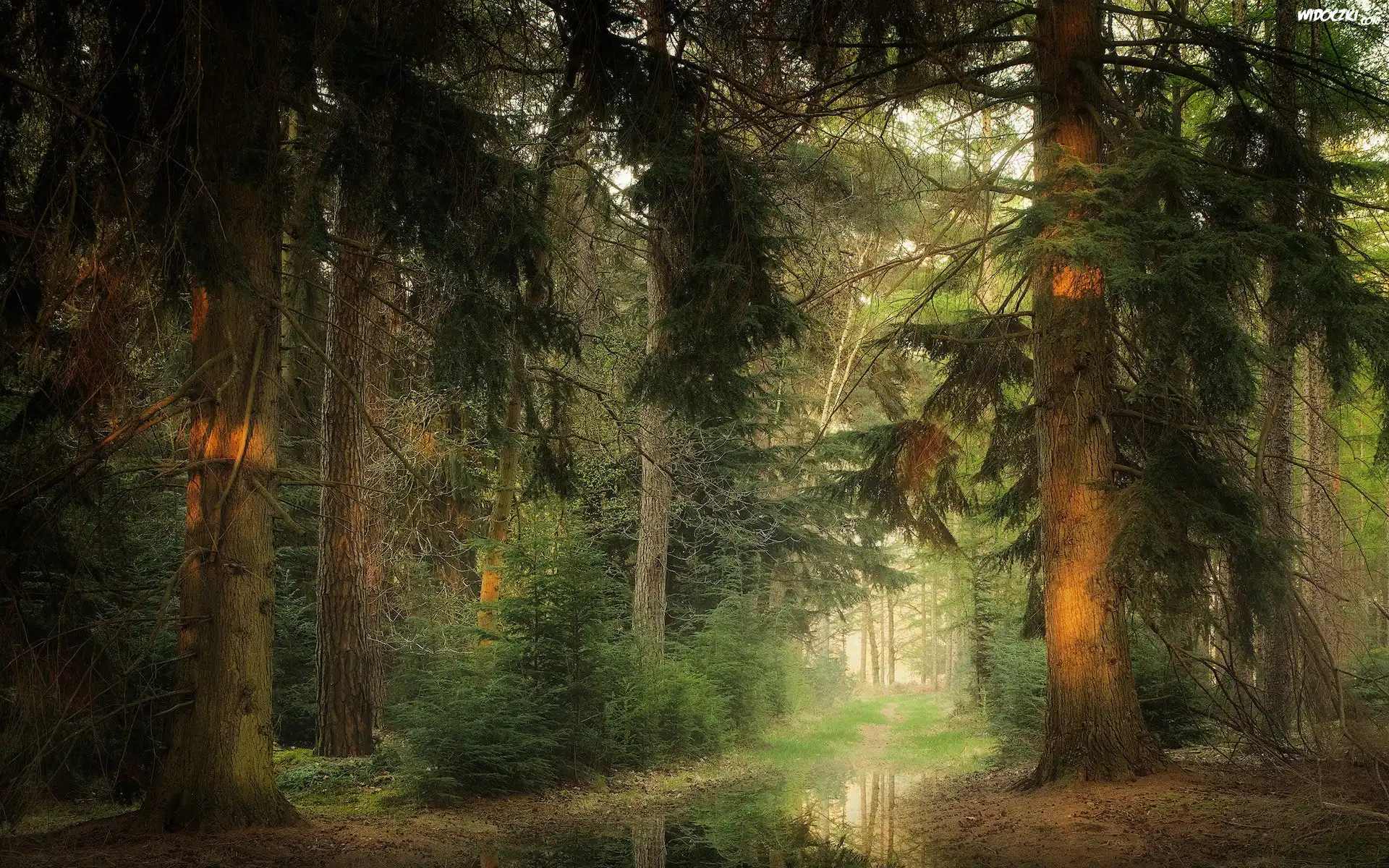 Zdjęcia, Las, Drzewa, Wiosna, Kałuża