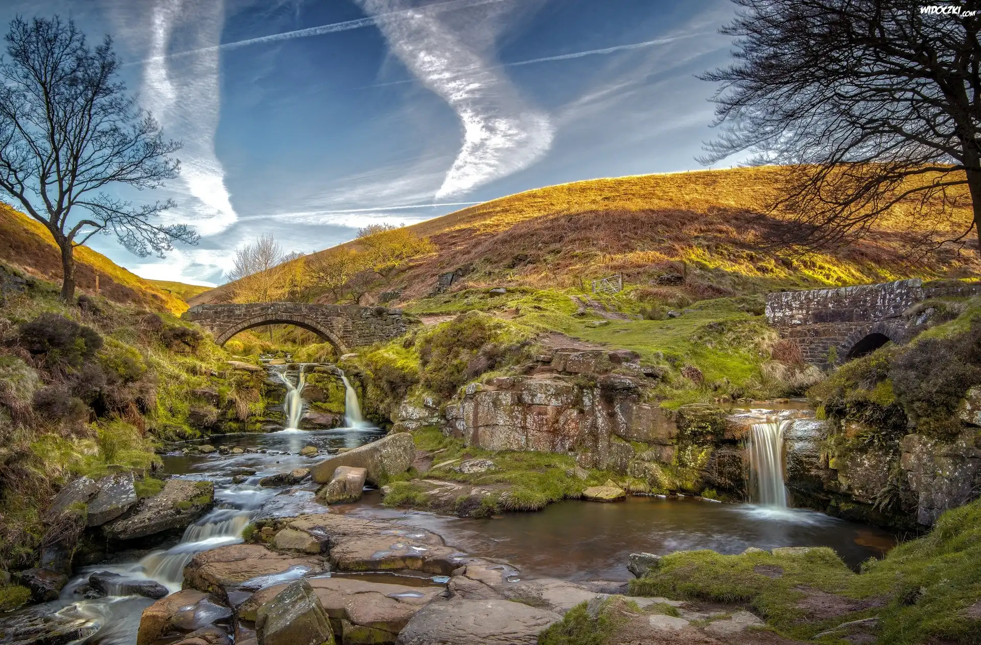Zdjęcia, Anglia, Three Shire Heads, Wzgórza, Kamienie, Skała, Most, Rzeka Dane, Drzewa, Chmury