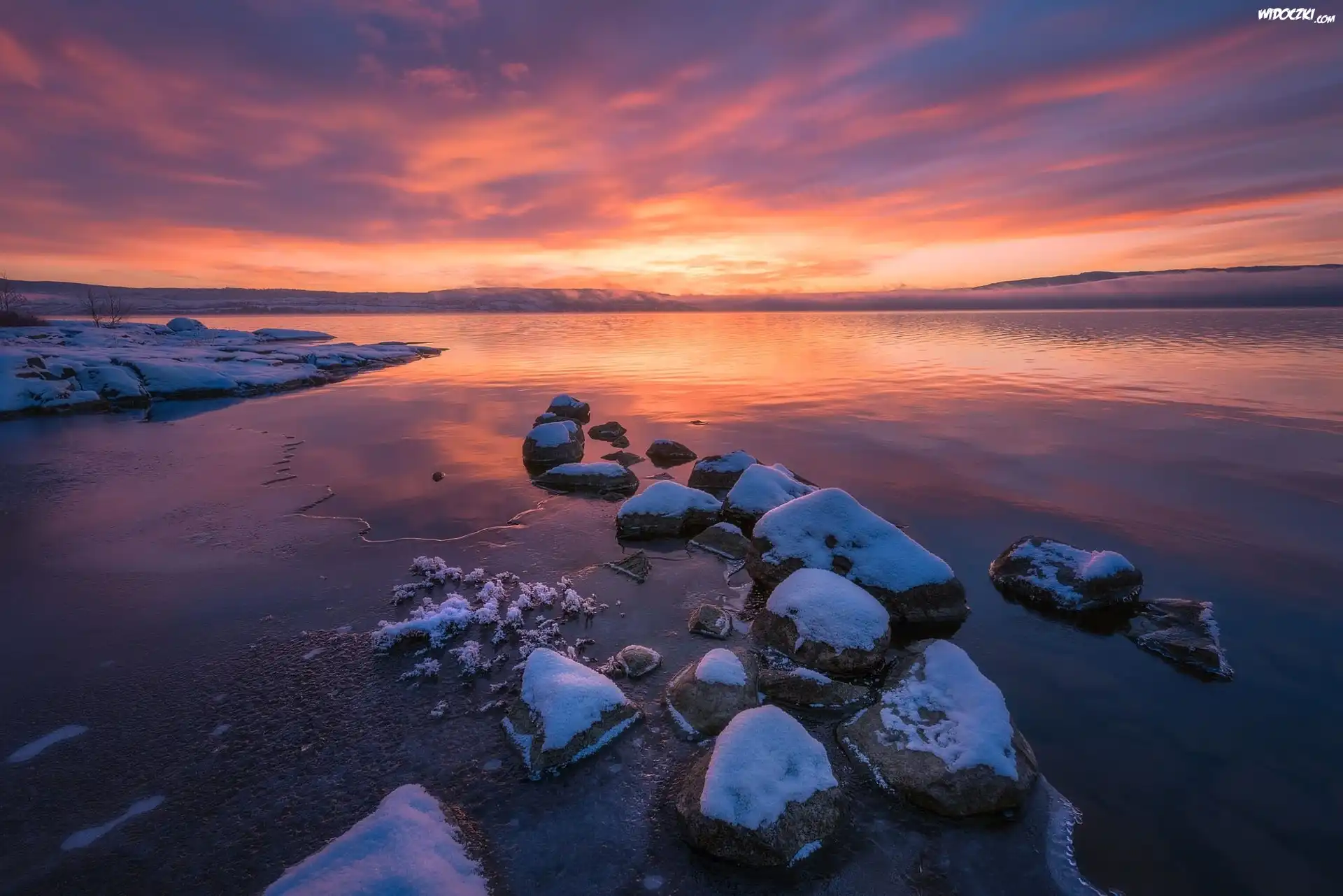 Zdjęcia, Norwegia, Okręg Buskerud, Jezioro Tyrifjorden, Zachód Słońca, Śnieg, Kamienie