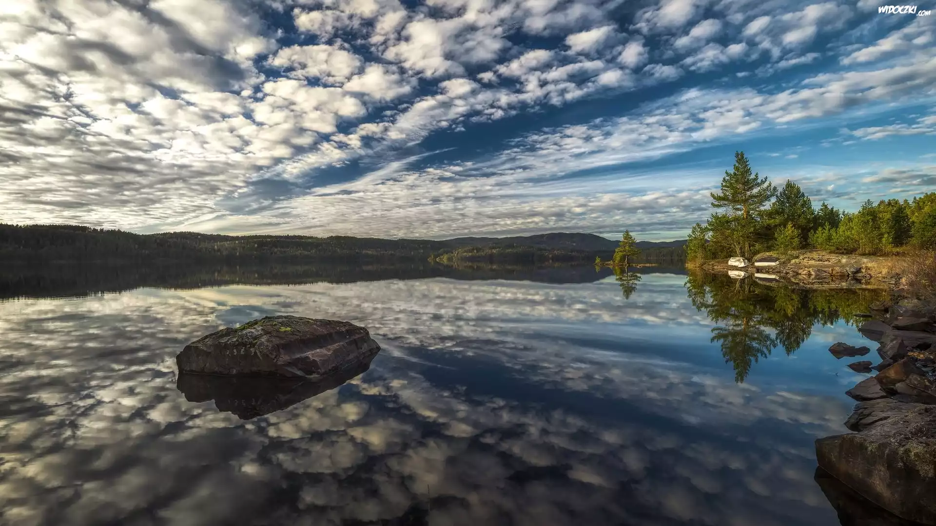 Zdjęcia, Kamienie, Drzewa, Niebo, Odbicie, Chmury, Jezioro