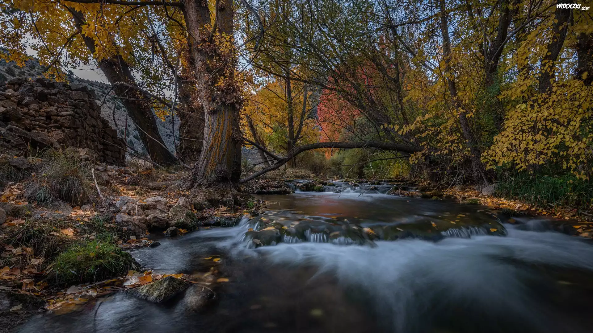 Zdjęcia, Jesień, Las, Skały, Kamienie, Rzeka, Drzewa
