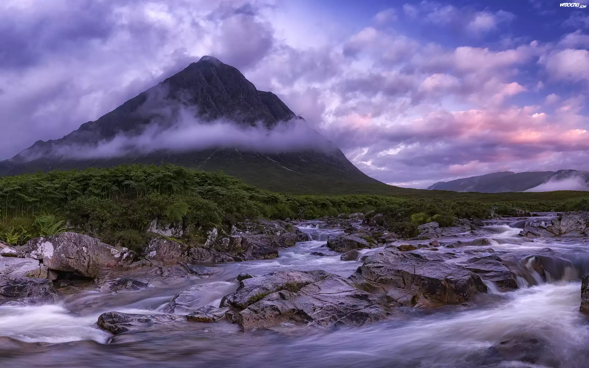 Zdjęcia, Szkocja, Góra, Szczyt Buachaille Etive Mor, Chmury, Rzeka Coupall, Kamienie