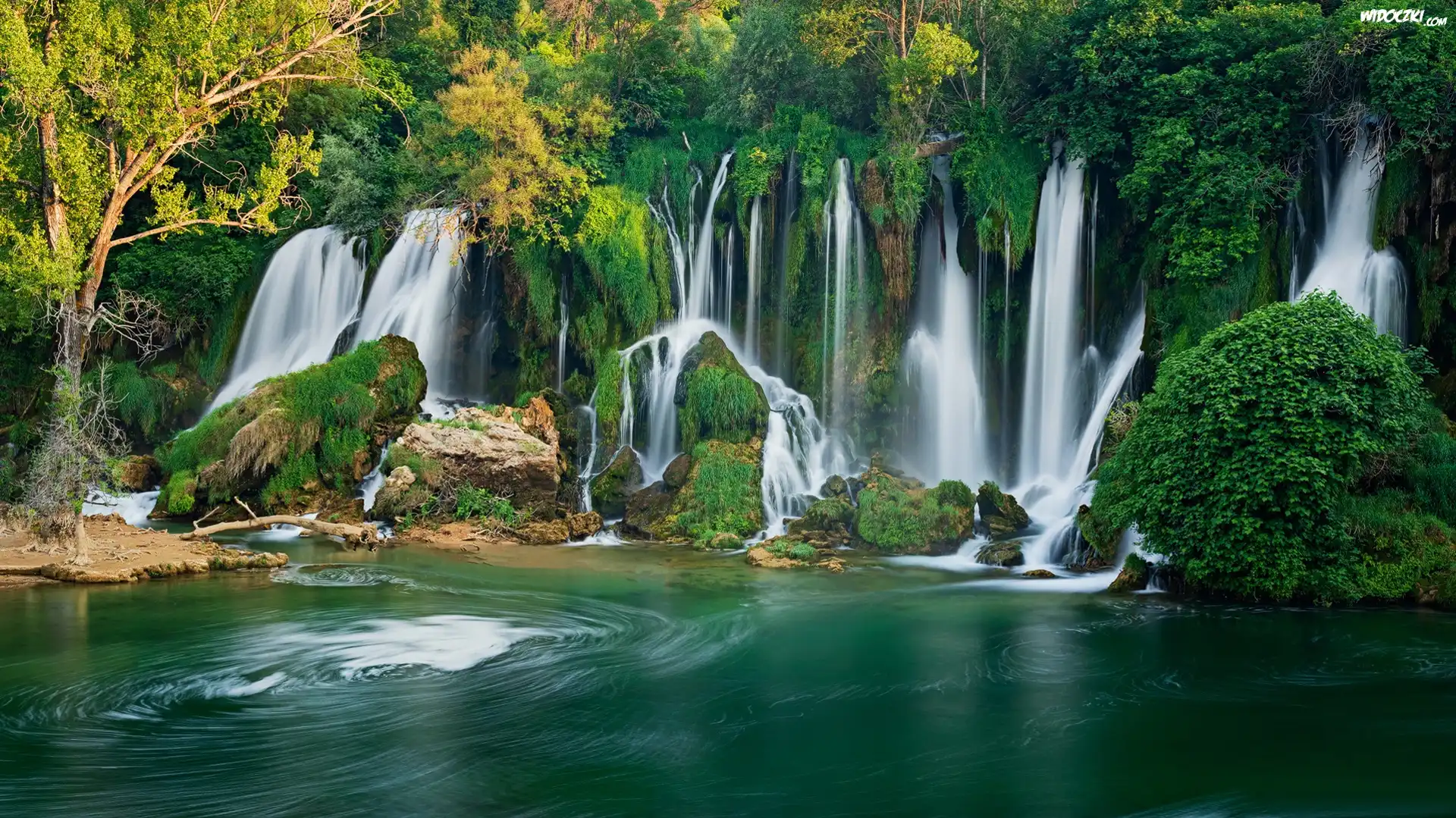 Bośnia i Hercegowina, Wodospady Kravica, Rzeka Trebizat, Omszałe, Skały, Kamienie, Drzewa, Roślinność |