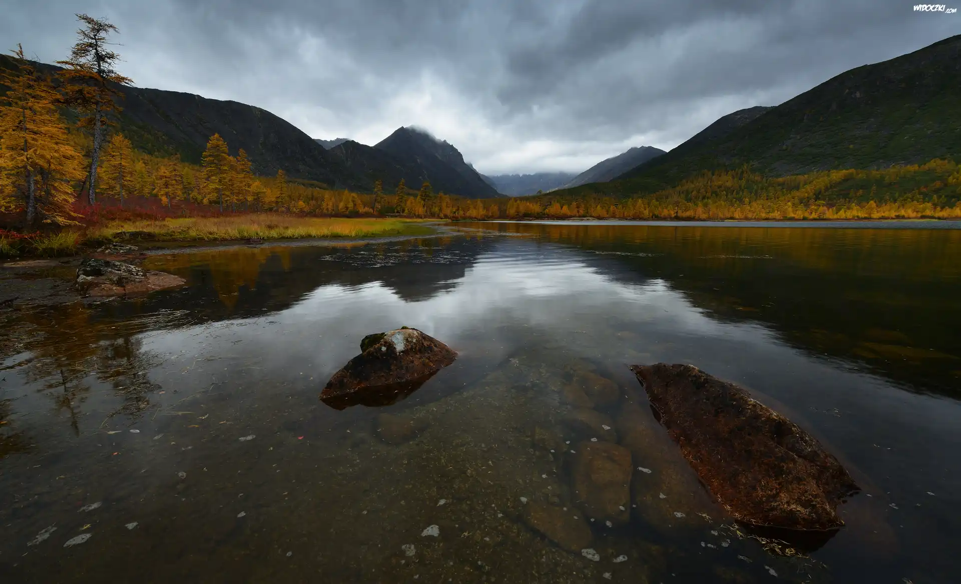 Jesień, Góry, Masyw Angachak, Drzewa, Kamienie, Jezioro Nevidimka, Kołyma, Obwód magadański, Rosja
