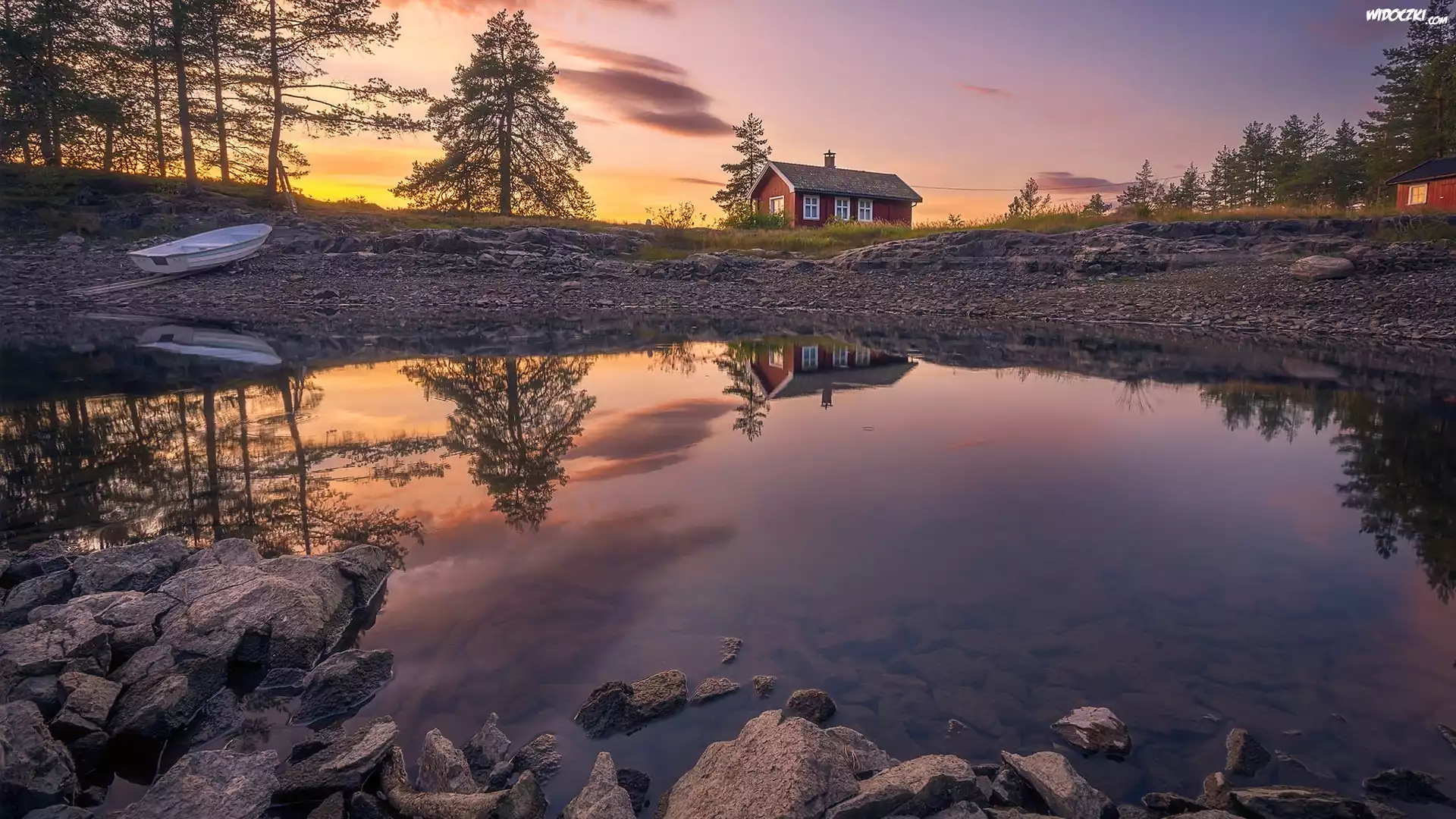 Norwegia, Ringerike, Jezioro Vaeleren, Drzewa, Łódka, Dom, Kamienie