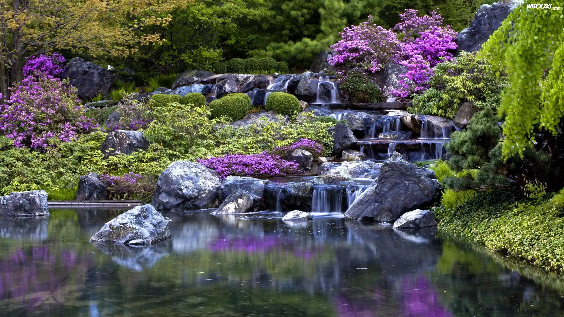 Kamienie, Krzewy, Kaskada, Staw