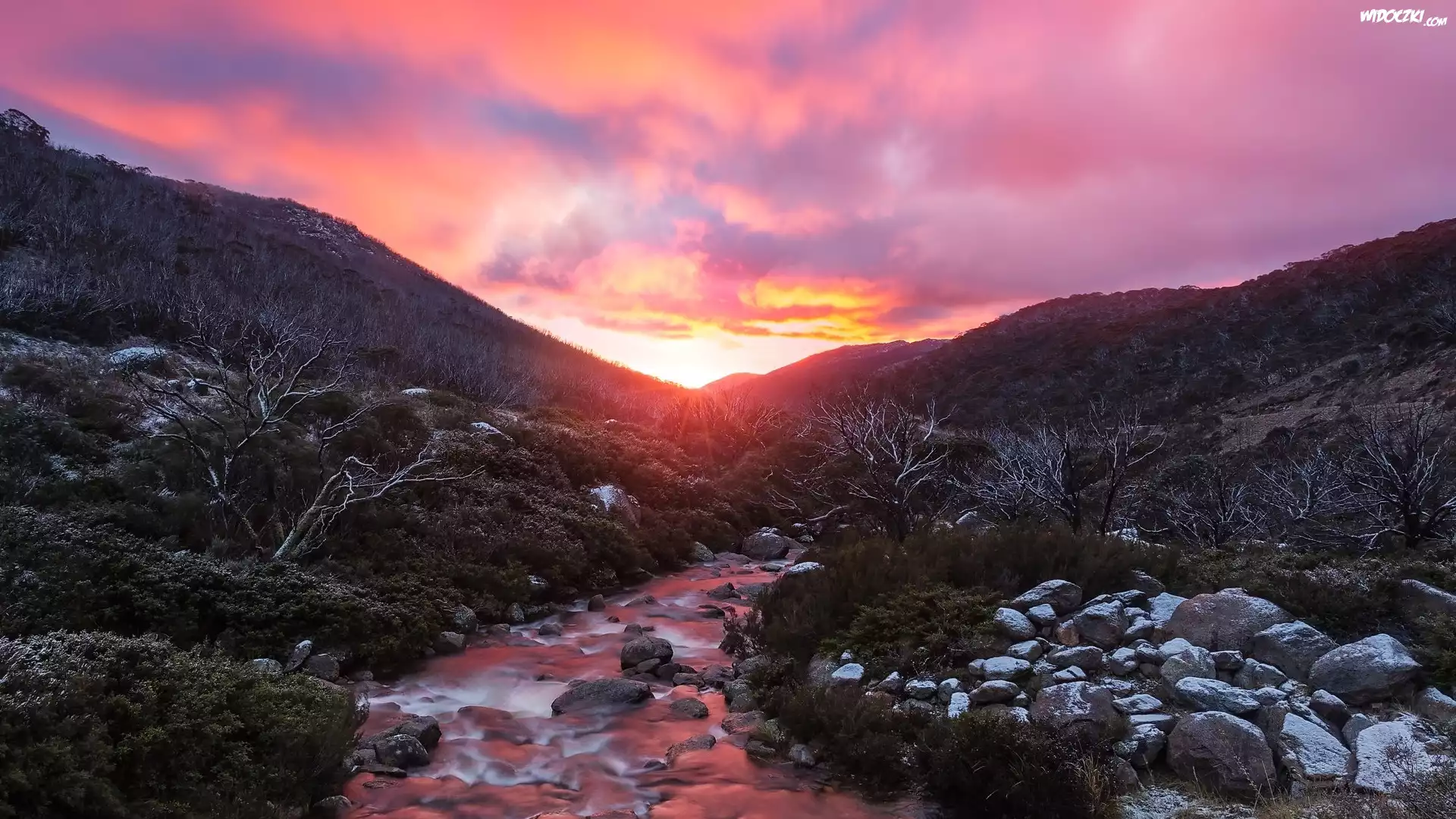Wschód słońca, Góry, Kamienie, Potok, Krzewy