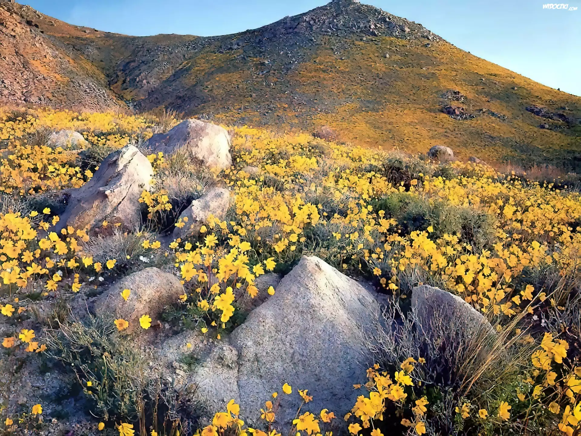Zdjęcia, Łąka, Kwiatki, Kamienie, Góry