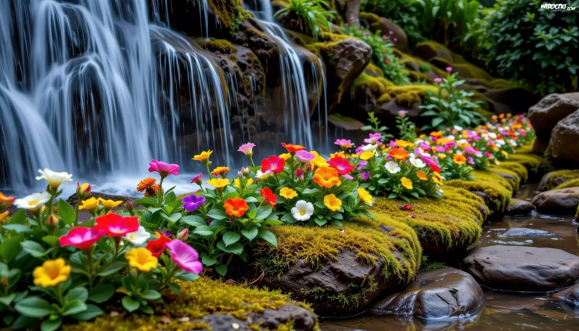 Zdjęcia, Wodospad, Skała, Kwiaty, Kamienie, Ogród, Rośliny, Grafika