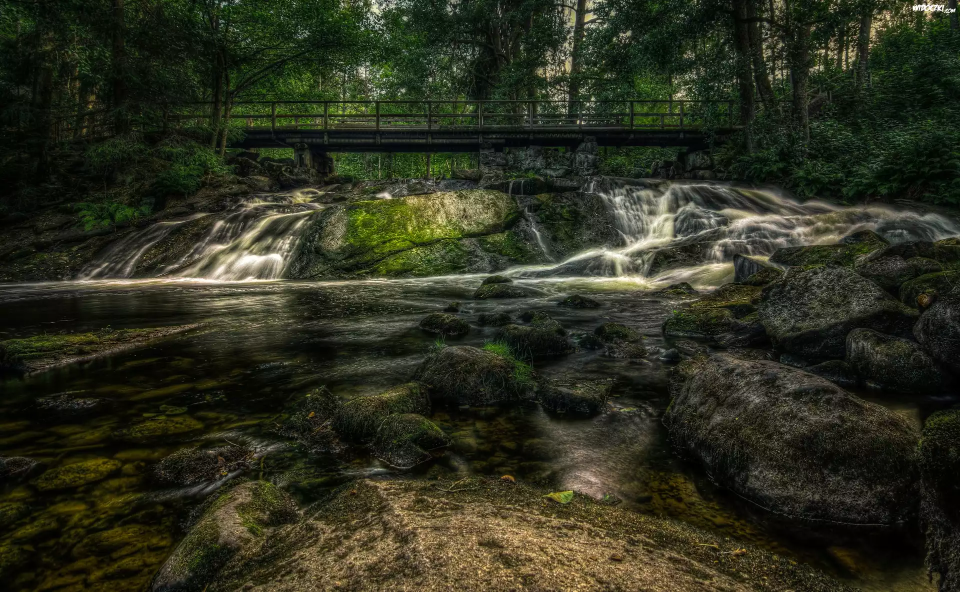 Las, Drzewa, Rzeka Karjaanjoki, Omszałe, Kamienie, Skały, Wodospad Myllykoski, Most, Karkkila, Finlandia |