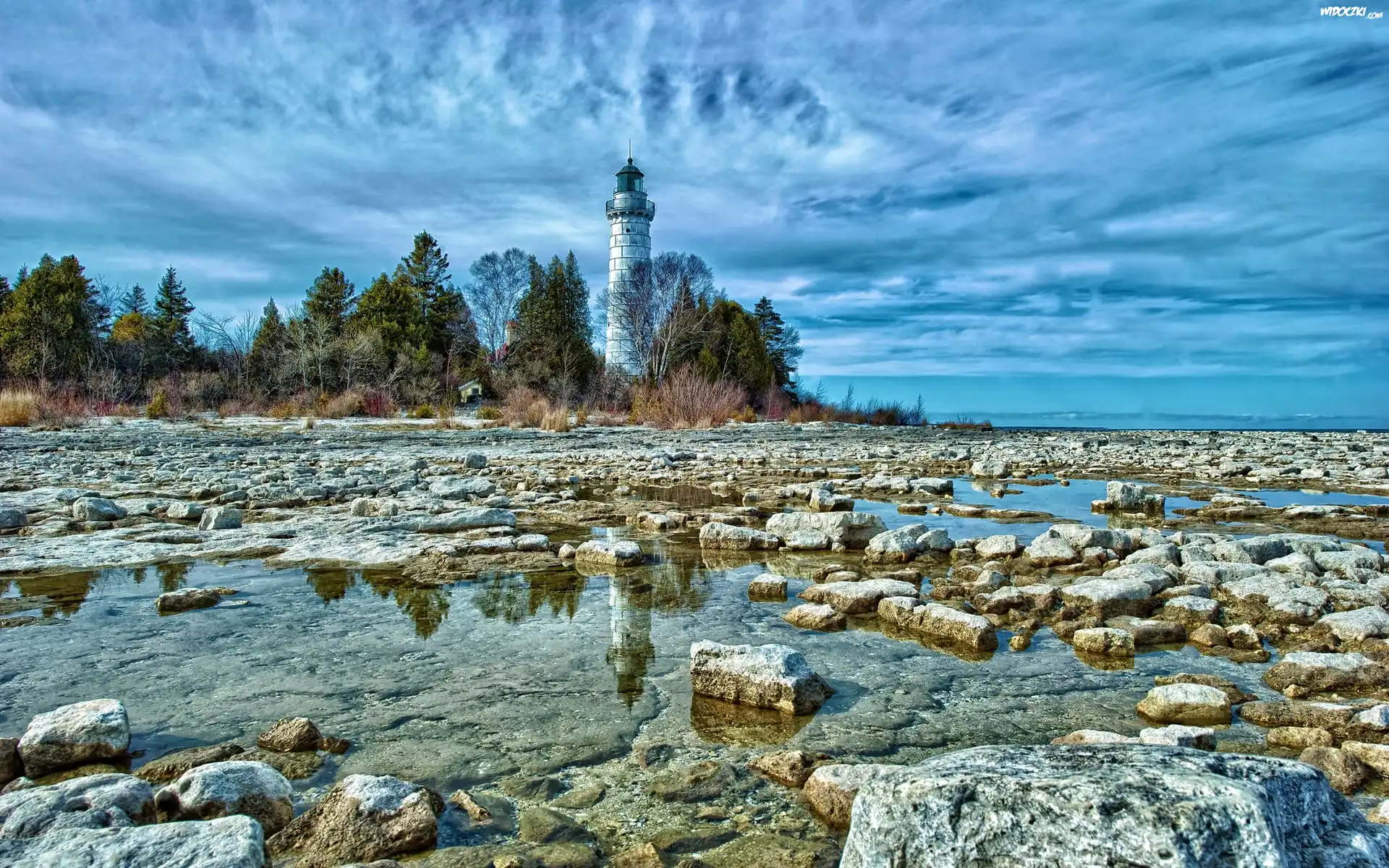 Kamienie, Zachmurzone, Niebo, Latarnia, Morska