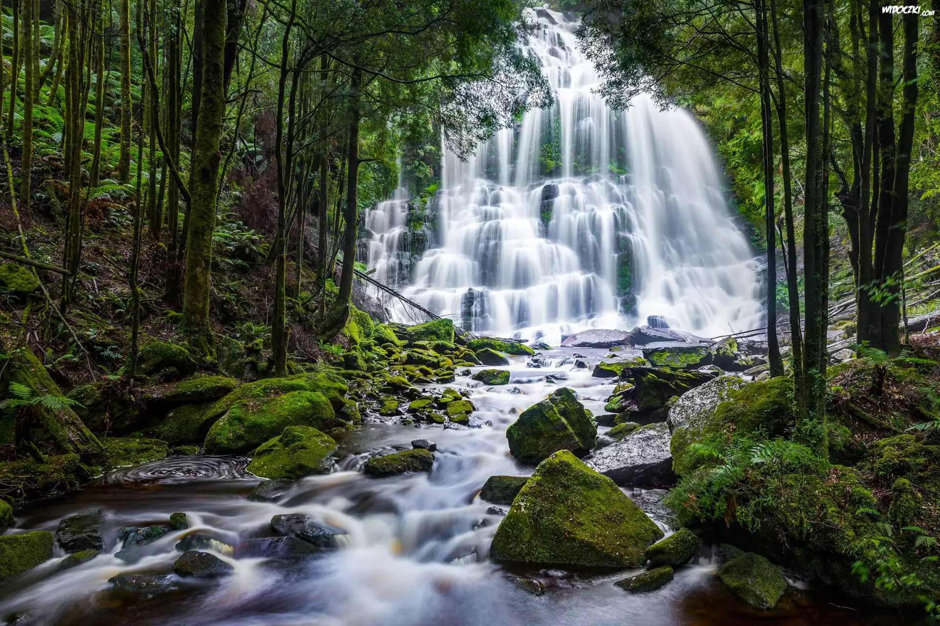 Zdjęcia, Las, Drzewa, Skały, Wodospad, Nelson Falls, Kamienie, Mech, Potok, Tasmania, Australia