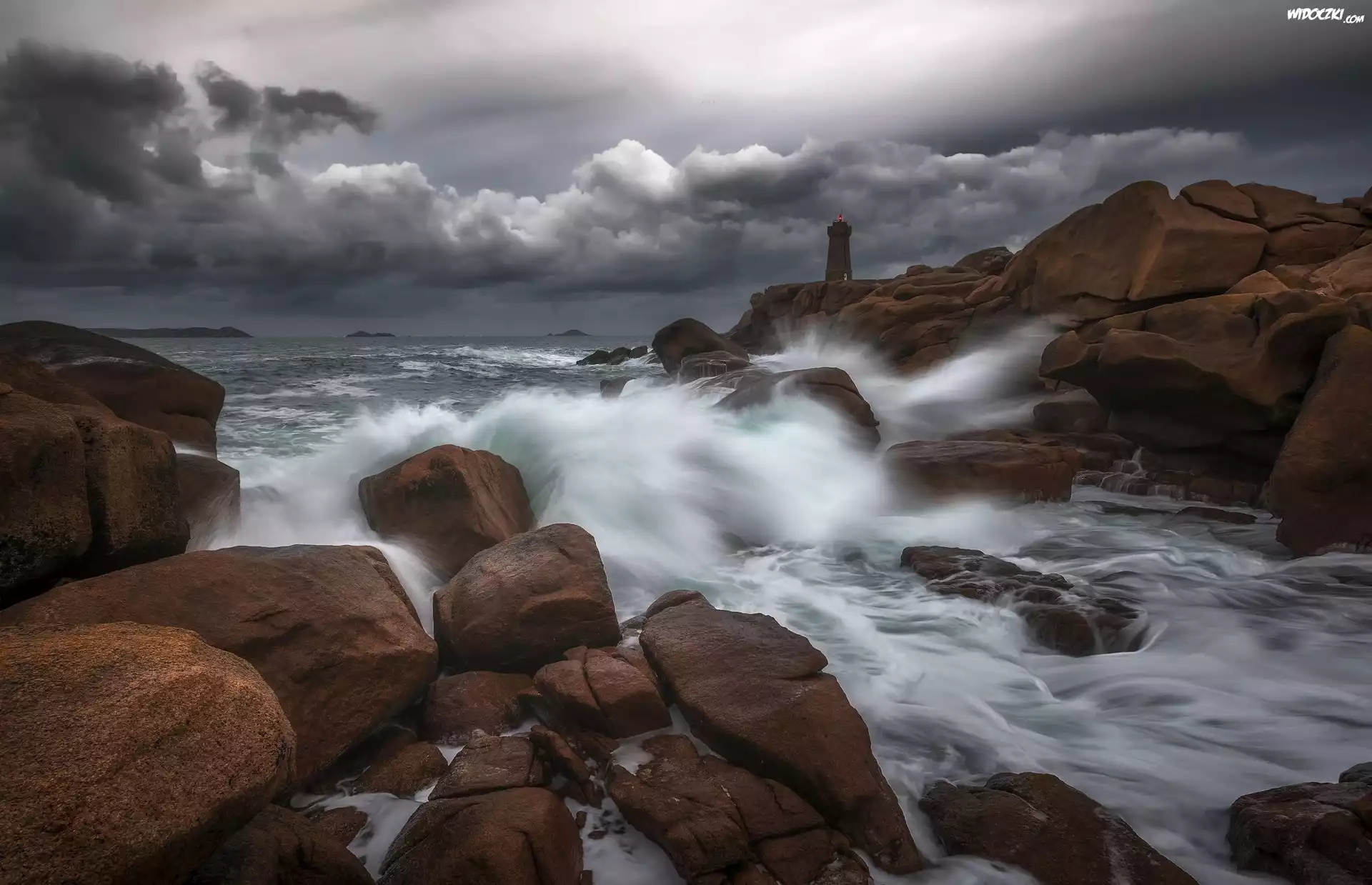Zdjęcia, Morze, Kamienie, Fale, Skały, Latarnia morska, Chmury